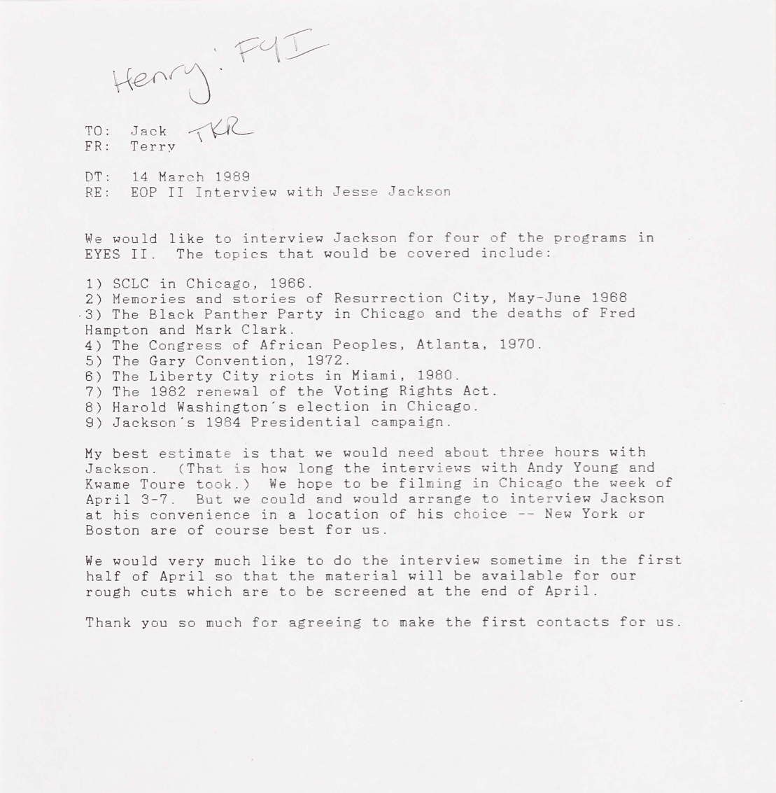 Rockefeller, Terry Kay. Letter. 1989. “Jesse Jackson Interview Memo”. Paper, 1989, More than Talking Heads, accessed February 11, 2026, https://digitalexhibits.library.wustl.edu/s/more-than-talking-heads/item/2246