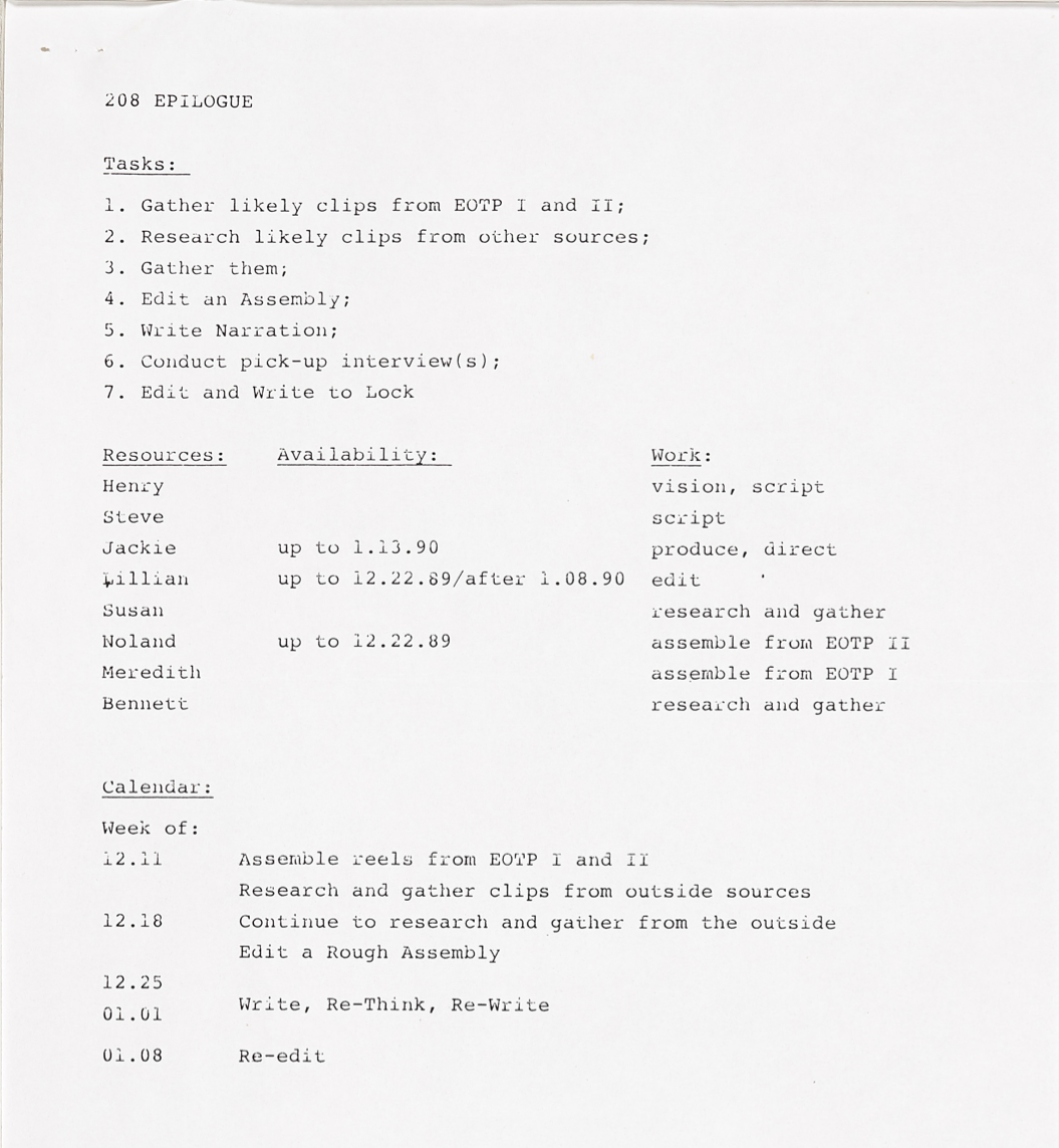 This document lists tasks, as well as a calender of important dates and personell information, in regards to the creation of the final epilogue for episode 8 which would wrap up the entire series of Eyes on the Prize. Although specifically for episode 8, the tasks and calender order are standard for any documentary production, and perhaps offer a glimpse of the intial process for other segments of the series.