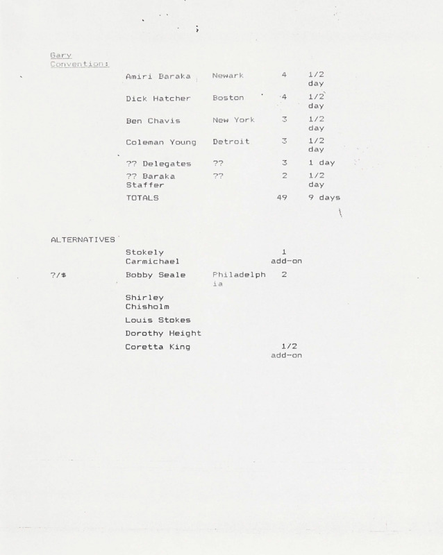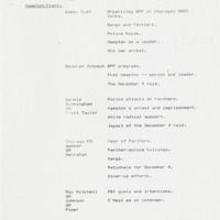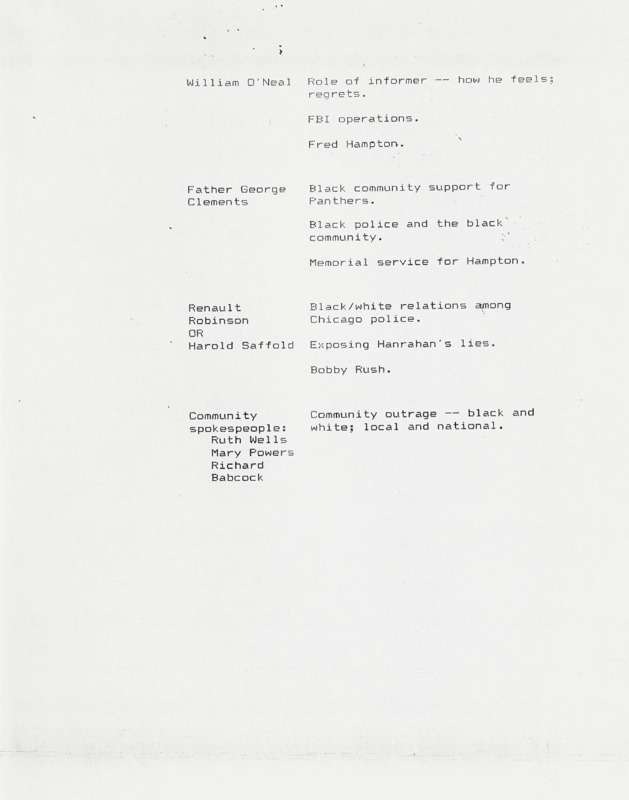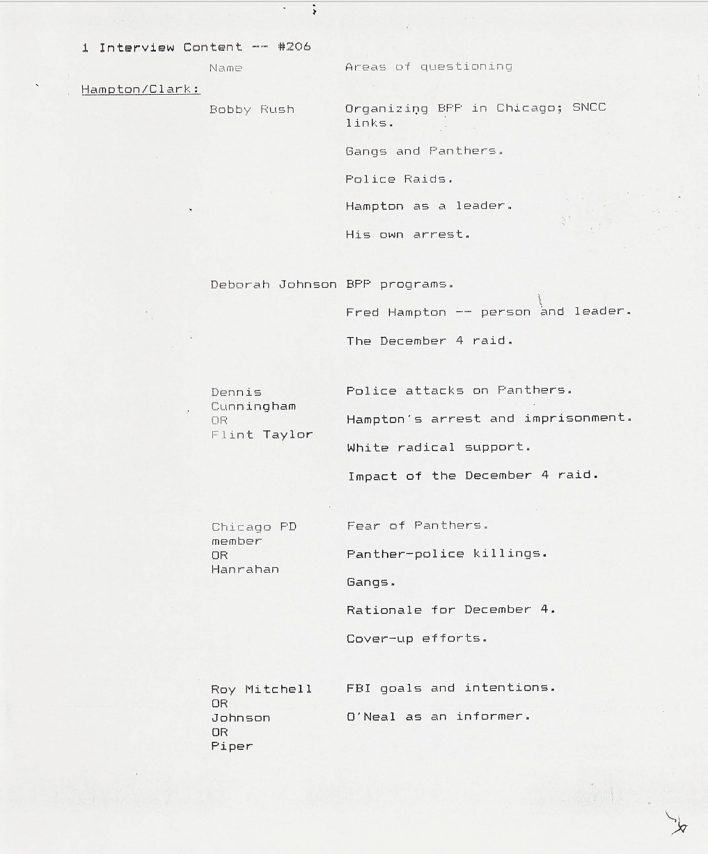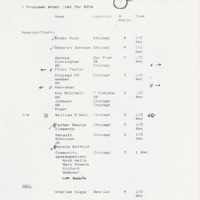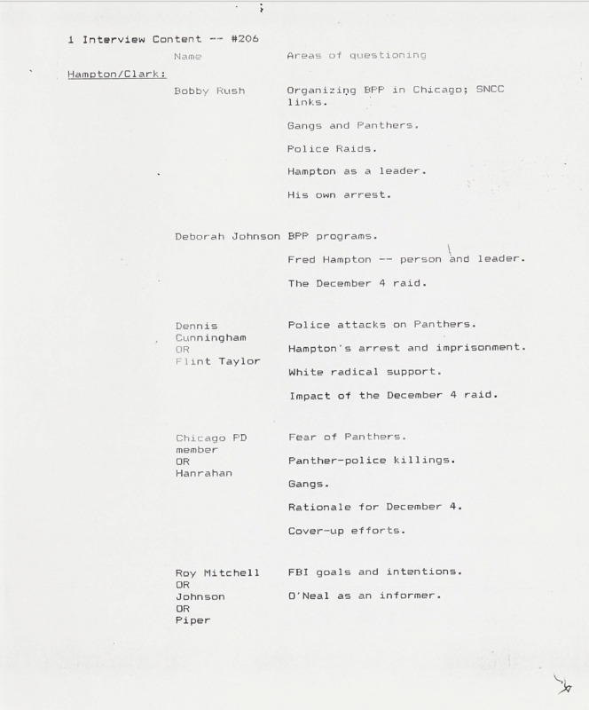 In the beginning stages of every episode, a proposed shoot and content list for interviews would be developed. This one, for episode six of the series, outlines individuals to interview with a connection to the Black Panther Party, as well as those who were in attendance at the National Black Political Convention in Gary, IN. By listing possible interviews at this stage, it would allow for those in the production to estimate how much film and manpower would be necessary, as well as travel.