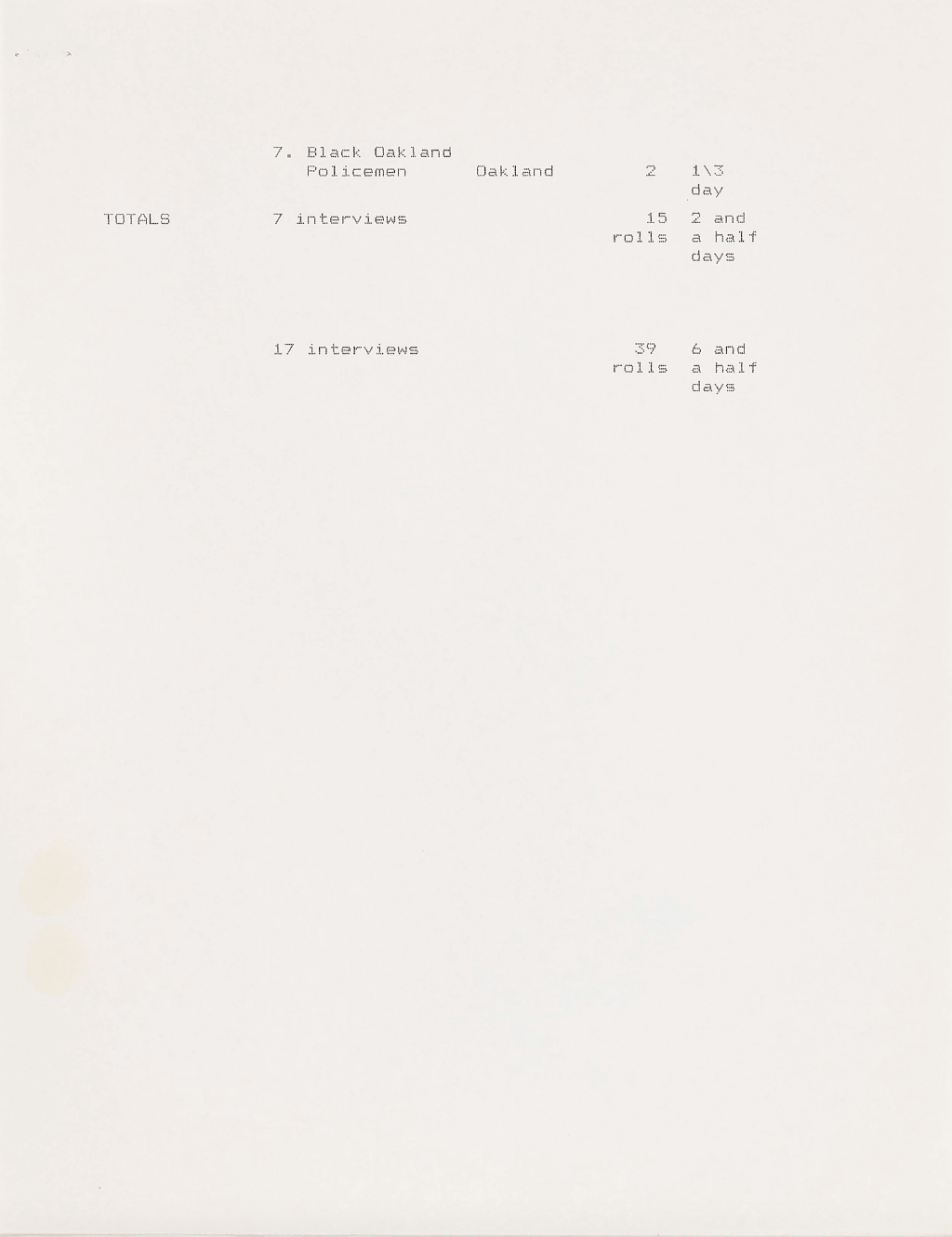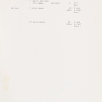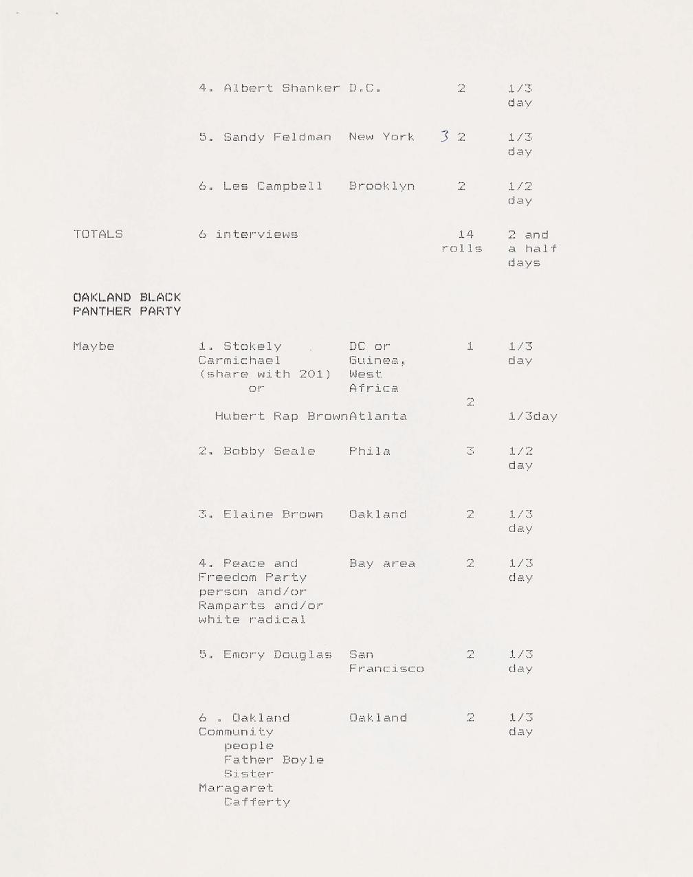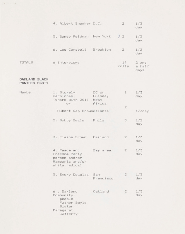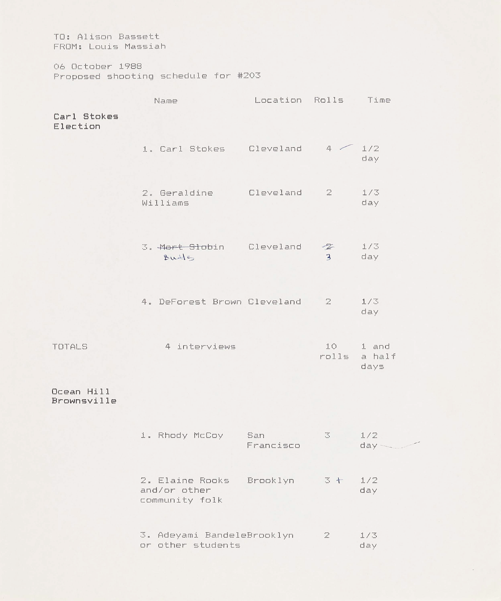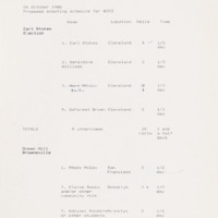 In the beginning stages of every episode, a proposed shoot and content list for interviews would be developed. This one, for episode three of the series, outlines individuals to interview with a connection to the Cleveland election of Carl Stokes as mayor, as well as those involved with the Ocean Hill-Brownsville experimental school district. By listing possible interviews at this stage, it would allow for those in the production to estimate how much film and manpower would be necessary, as well as travel.