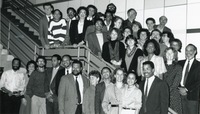 Eyes II Staff Photo A group photo with much of the staff involved with Eyes II. From top left, front row (at railing): James A. DeVinney, Willa Mathis-Johnson, Lillian Benson, Jacqueline Shearer; Sheila Curran Bernard, Maia Harris, Janet Lawrence, Sarah Flynn, Madison Davis Lacy Top, middle: Chuck Scott, Thomas Ott, Valerie Linson, Terry Kay Rockefeller, Janet Lawrence, Alison Bassett, Susan Levine, Robert Lavelle, unknown, Portia Maultsby Top, back row (from center): Sam Pollard, Steve Fayer, Paul Stekler, John Else Front: Kirk Johnson, Lorraine Flynn Kiley, John Grabowski, Louis Massiah, unknown, Henry Hampton, Kiki Zeldes, Judy Richardson, Barbara Howard, Suzette Malveaux, Noland Walker -