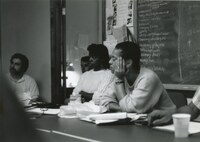 Muhammad Ali Interview Photograph A production photograph of team B interviewing prize-winning boxer Muhammad Ali in his Chicago home. Pictured, from left to right: Judy Richardson, Samuel Pollard, Michael Chin, David Obermeyer, Otis W. Bess Jr., and Muhammad Ali. -