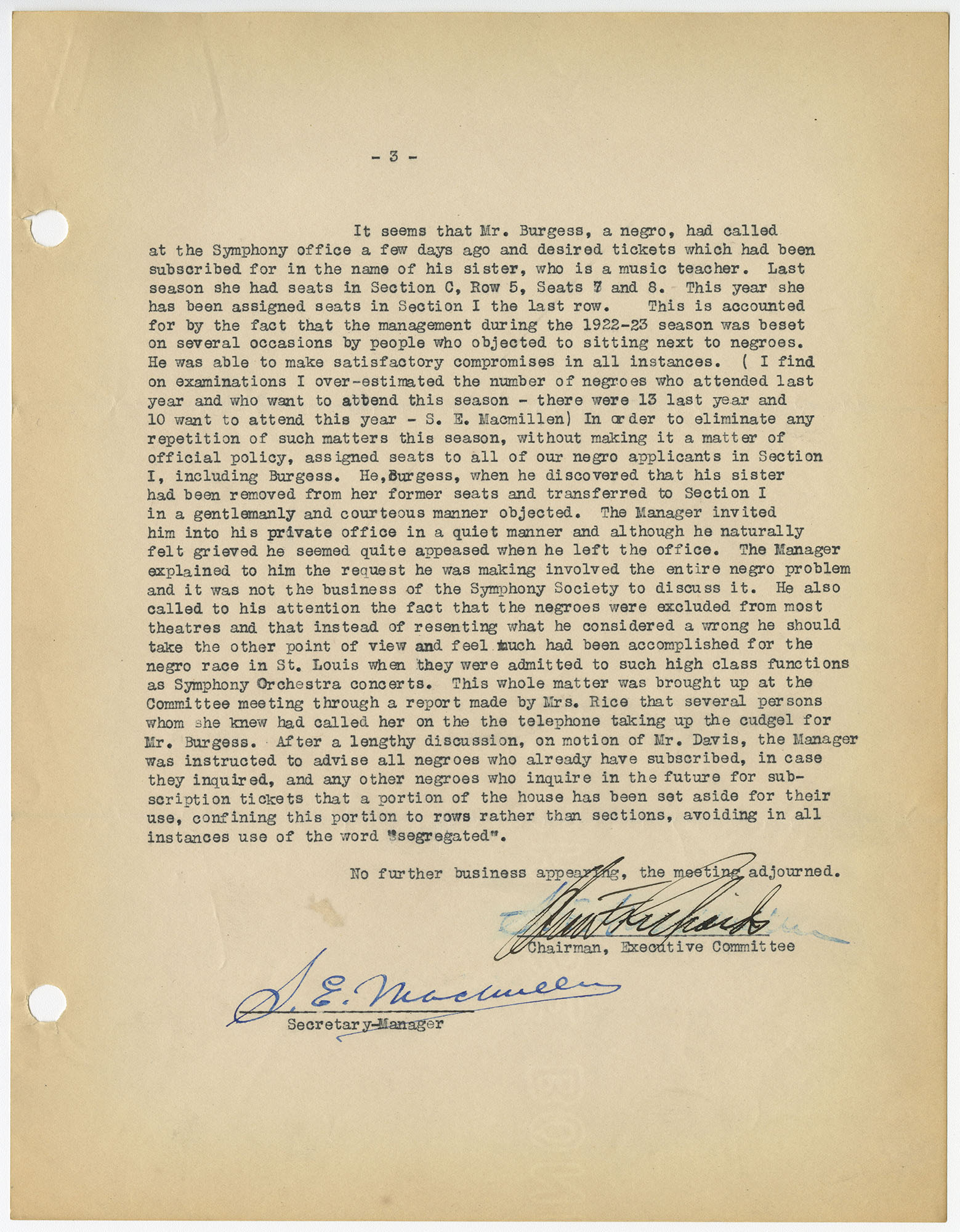 Saint Louis Symphony. 1923. “Minutes – Executive Committee Meeting - Thursday, October 18 [1923].”, Music and Racial Segregation in Twentieth-Century St. Louis: Uncovering the Sources, accessed February 11, 2026, https://digitalexhibits.library.wustl.edu/s/music-segregation/item/39981