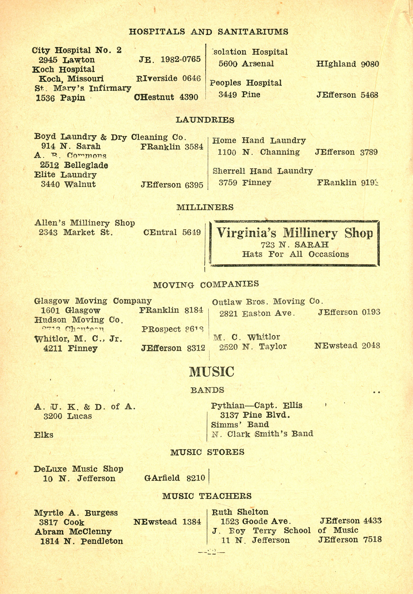 St. Louis: Urban League of St. Louis. 1933. St. Louis Negro Business and Trade Directory, 1934, Music and Racial Segregation in Twentieth-Century St. Louis: Uncovering the Sources, accessed March 11, 2026, https://digitalexhibits.library.wustl.edu/s/music-segregation/item/39986