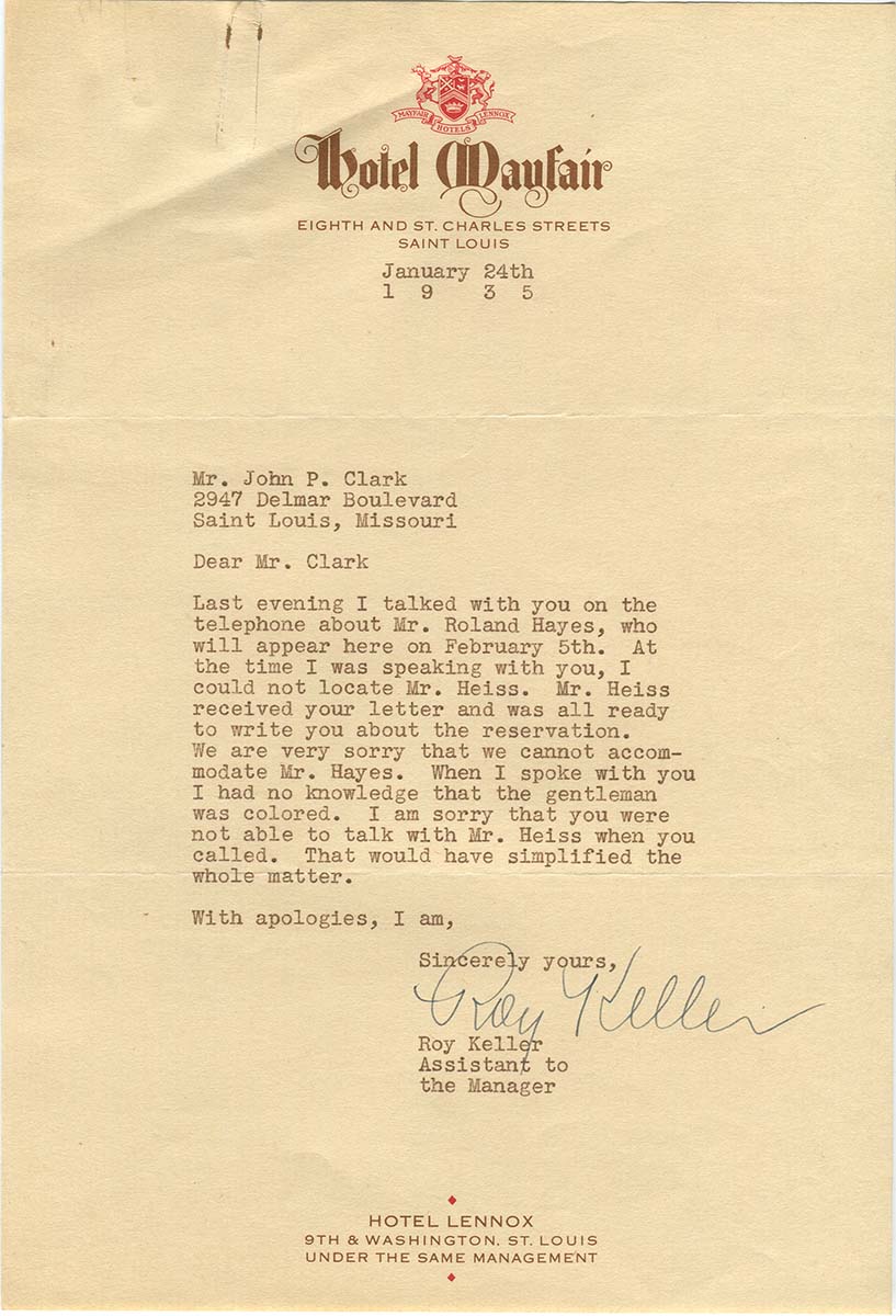 St. Louis: Urban League of St. Louis. 1935. Letter from Roy Keller to John [T.] Clark, January 24, 1935., Music and Racial Segregation in Twentieth-Century St. Louis: Uncovering the Sources, accessed February 11, 2026, https://digitalexhibits.library.wustl.edu/s/music-segregation/item/40015