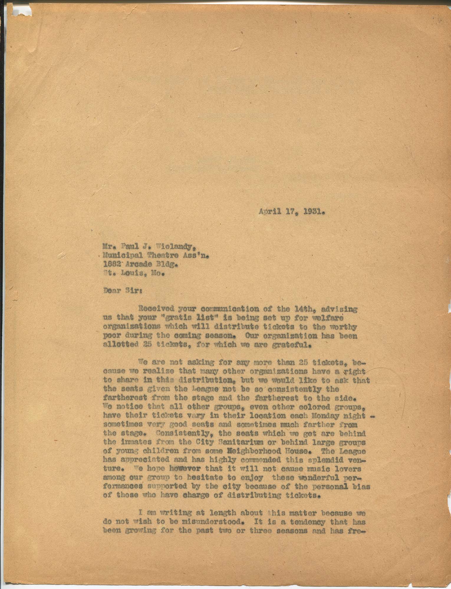 St. Louis: Urban League of St. Louis. 1931. Letter from John T. Clark to Paul J. Wielandy, April 17, 1931., Music and Racial Segregation in Twentieth-Century St. Louis: Uncovering the Sources, accessed February 11, 2026, https://digitalexhibits.library.wustl.edu/s/music-segregation/item/40078
