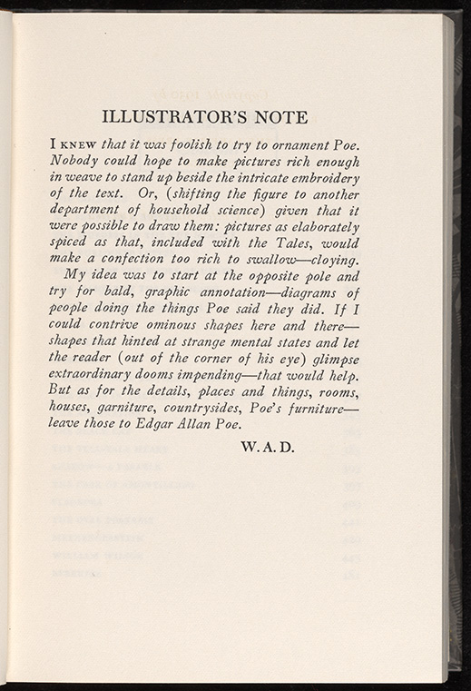 Dwiggins, William Addison. 1929. Illustrator’s Note from Tales by Edgar Allen Poe, Illustrated by W. A. Dwiggins. Rare Book Collections. The Lakeside Press, Re-Drawn: Pictures, Plots & Portrayals from Special Collections, accessed February 11, 2026, https://digitalexhibits.library.wustl.edu/s/redrawn/item/47909
