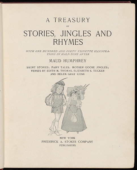 Maud Humphrey, Edith M. Thomas, Elizabeth S. Tucker and Helen Gray Cone. 1893. Title Page, A Treasury of Stories, Jingles and Rhymes Illustrated by Maud Humphrey. Rare Book Collections. Frederick A. Stokes Company, Re-Drawn: Pictures, Plots & Portrayals from Special Collections, accessed April 1, 2026, https://digitalexhibits.library.wustl.edu/s/redrawn/item/47939