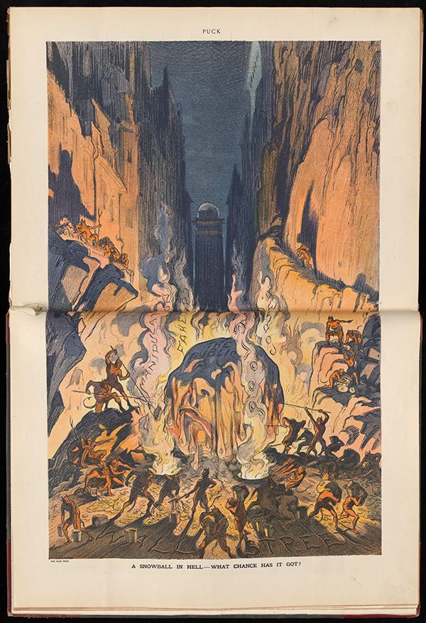 Keppler, Udo. 1912. Puck, Interior Illustration, "A Snowball in Hell". Dowd Illustration Research Archive. Joseph Keppler, Re-Drawn: Pictures, Plots & Portrayals from Special Collections, accessed February 11, 2026, https://digitalexhibits.library.wustl.edu/s/redrawn/item/48089