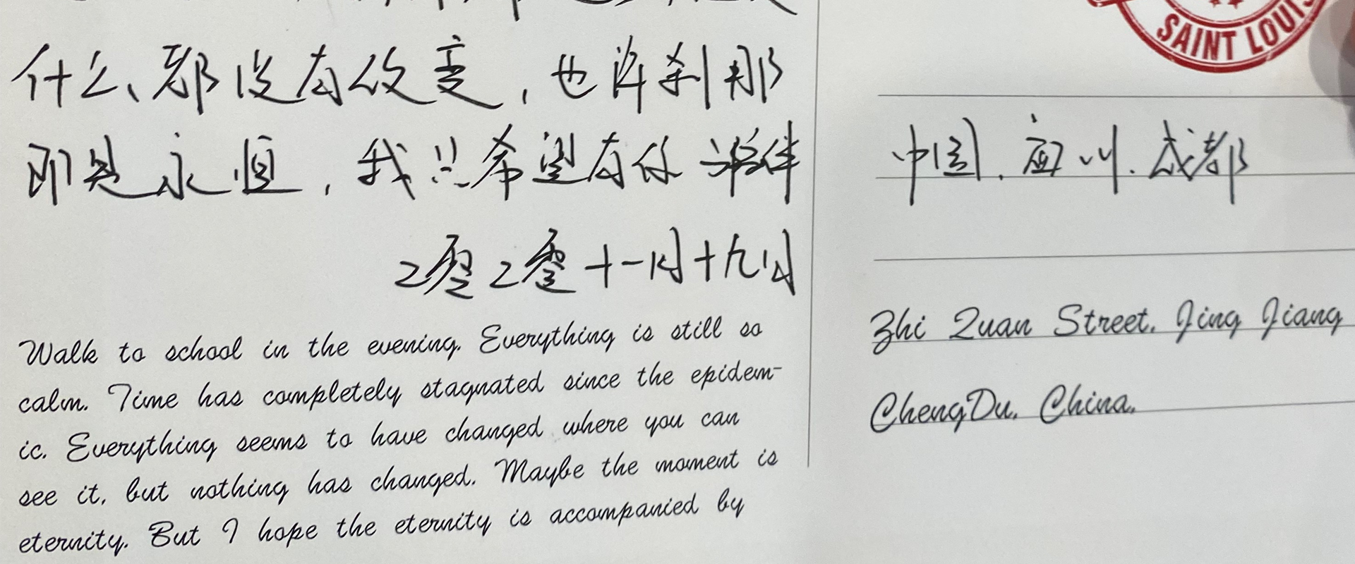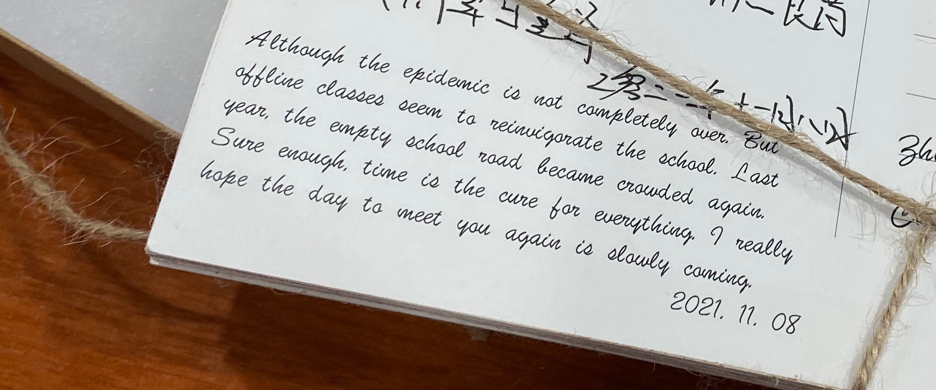 The artist recalls her experience of the COVID-19 pandemic from March, 2020 through November, 2021 as a student at Washington University in St. Louis, unable to go home to China. She creates a series of postcards to send to her family in Chengdu, chronicling her daily life and depicting the loneliness of a campus in lockdown with stark pen-and-ink drawings. - Publisher