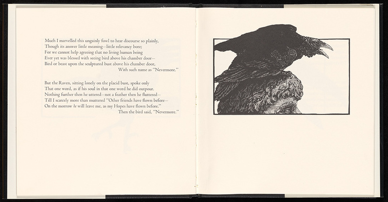 Most likely commissioned by a wealthy collector with a distinct fondness for the poem, this lovingly crafted volume is done in a style of illumination, binding, and calligraphy made to emulate medieval manuscripts and holy texts. The illustration on the first spread of the poem, though the sole image of the bird in this volume, nests among intricate and extravagant ornamentation meant to elevate the reading experience and treatment of the hand calligraphed text.