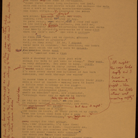 Typescript draft of possible poem selections for "Half Sun Half Sleep," including original place of publication, length and format notes. With holograph notes and corrections by Swenson.