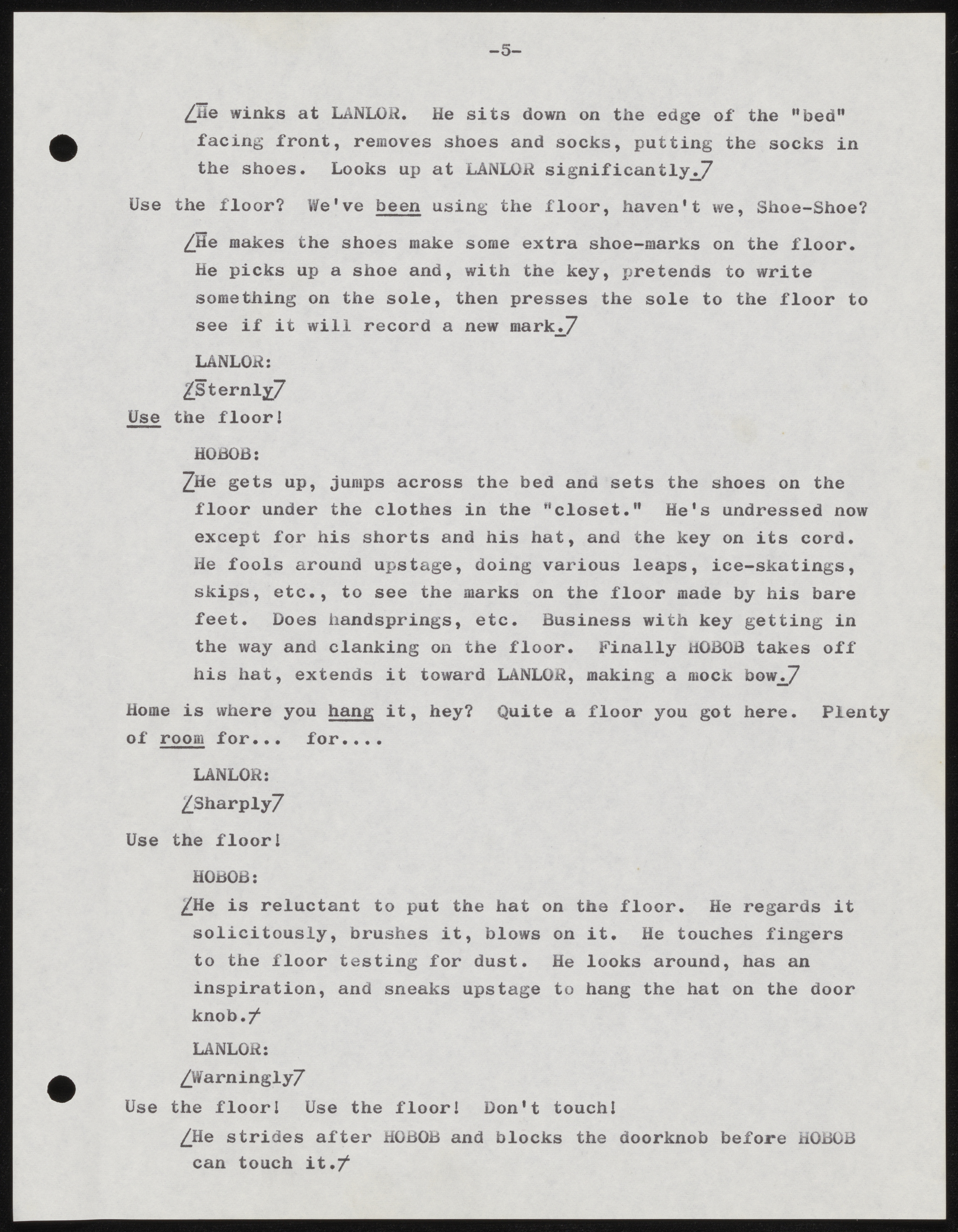 First scene from a script draft toward The Floor, a surreal one-act play by Swenson. She also oversaw production and performances at the American Place Theatre, during the 1965-66 season. Swenson's play was one of three plays by three writers performed together as Doubles and Opposites, the final full production of the season.