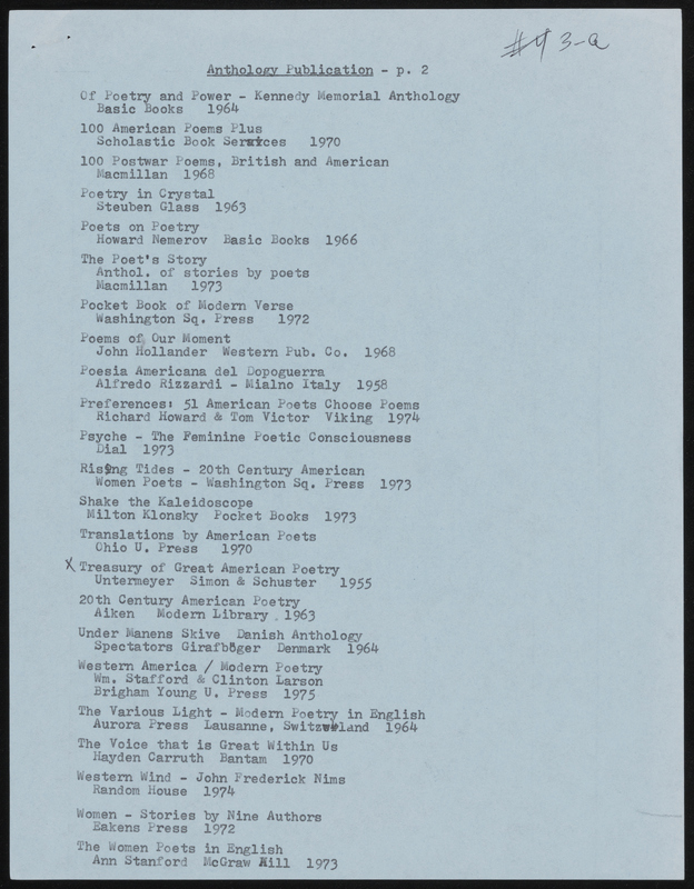Typescript drafts with holograph notes about Swenson's accomplishments and appearances as a poet, to promote her 1978 volume, New and Selected Things Taking Place