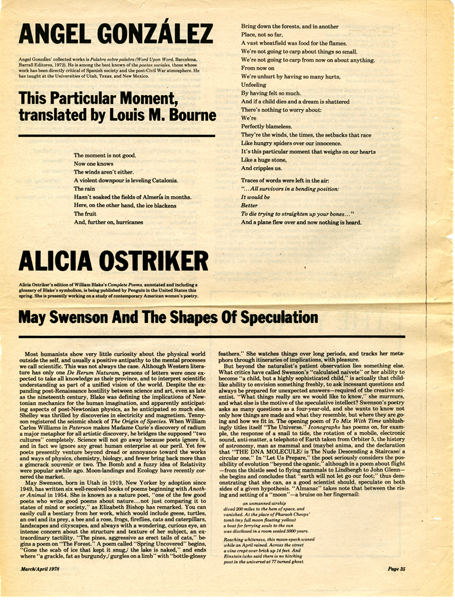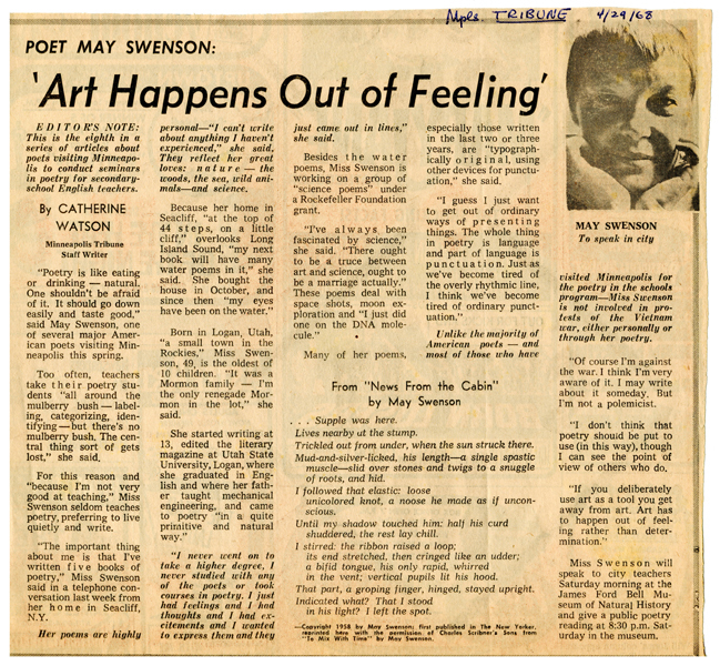 Like most writers, Swenson kept clippings and publications about her work and activities. These kinds of materials and more are part of Series 6: Ephemera. On this page you will find press coverage of Swenson, from her play premier in 1966, to a Newsday article in 1987. Also present are publications from some forums, conferences and organizations in which Swenson took part.