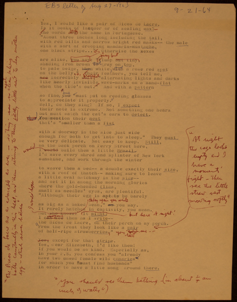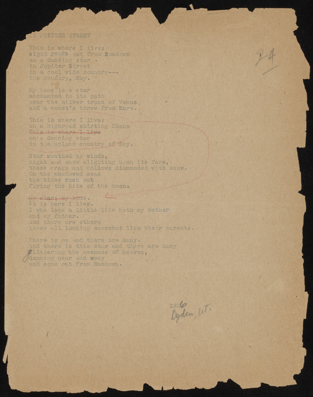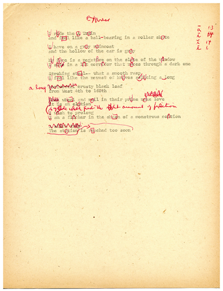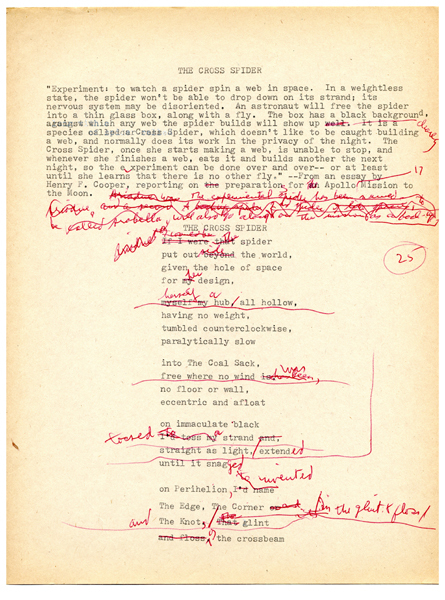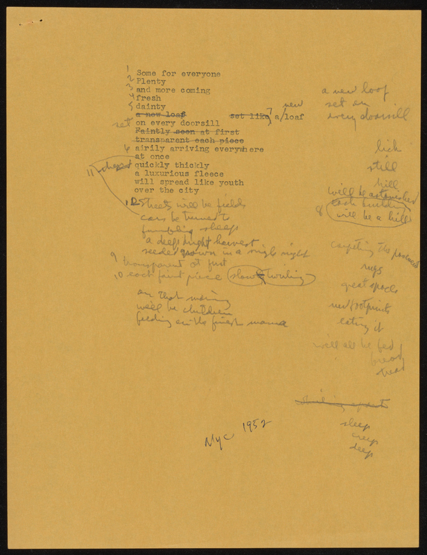 Perhaps especially after she started depositing her papers in the Modern Literature Collection, Swenson held onto her poem worksheets, often going so far as dating them and recording where they were eventually published. This kind of documentation is very helpful for students of Swenson and of poetry writing in general. This page showcases drafts from some of her earliest published poems to some of her later ones.