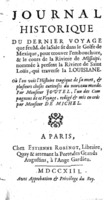 In 1684 Robert Cavelier, Sieur de La Salle, was planning an expedition to establish a French settlement at the mouth of the Mississippi River. Joutel met La Salle in Rouen and signed on as his "intendent" or confidential assistant. After a harrowing ocean crossing of over four months, La Salle and his party reached the Gulf of Mexico. Navigational errors caused them to miss the mouth of the Mississippi, instead making landfall in Matagorda Bay. La Salle was murdered by his crew during the journey back to the mouth of the Mississippi. Joutel, his nephew, and La Salle's brother escaped a similar fate, making their way to Tonti's fort on the Illinois River, travelling on to Quebec via the Great Lakes, and eventually returning to France in 1688. Shown here is the first French edition of Joutel's journal. -