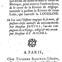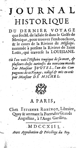 Joutel, Henri. “Journal Historique Du Dernier Voyage Que Feu M. De LaSale Fit Dans Le Golfe De Mexique, Pour Trouver l’embouchure, & Le Cours De La Riviere De Missicipi”. Chez E. Robinot, Terra Incognita, accessed February 10, 2026, https://digitalexhibits.library.wustl.edu/s/terra-incognita/item/18867