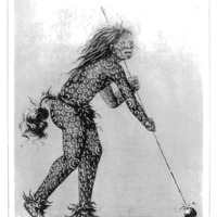 Some of the practices of this dance are similar to the Sun Dance, which was practiced by the Sioux and other groups in the West. Shown here is a dancer in the character of O-ke-hee-de, the owl or Evil Spirit.