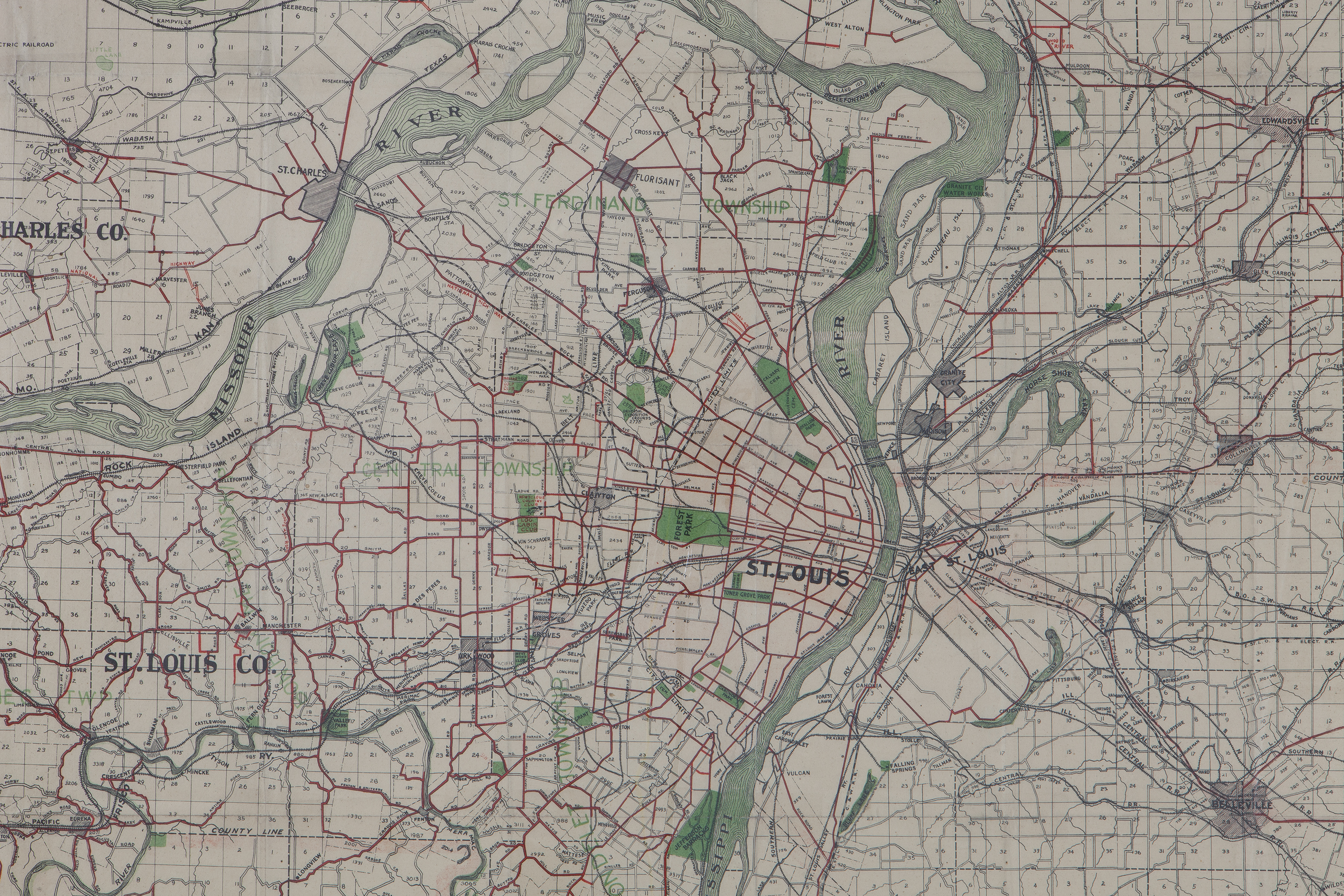 - Map showing major roads in the St. Louis metropolitan area before the appearance of Washington Park and other cemeteries along Natural Bridge. Courtesy of Missouri History Museum.