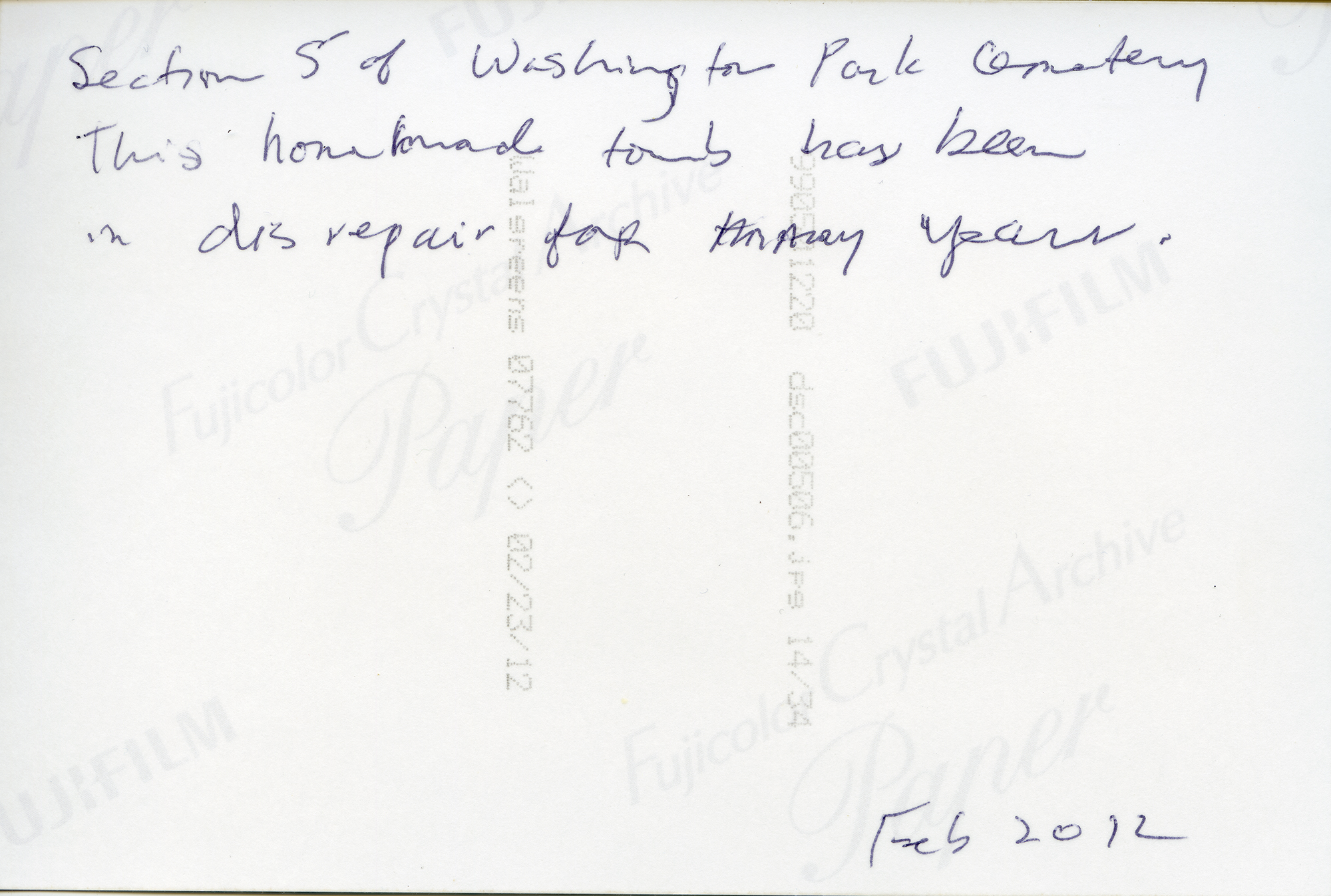 - Section 5 of Washington Park Cemetery. This homemade tomb has been in disrepair for many years. Feb 2012.