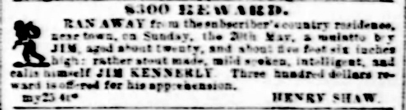 This newspaper ad was published in the Missouri Republican on May 25, 1855. Henry Shaw places a $300 reward for Jim, who, according to the ad, calls himself Jim Kennerly, who was enslaved by Shaw but escaped.