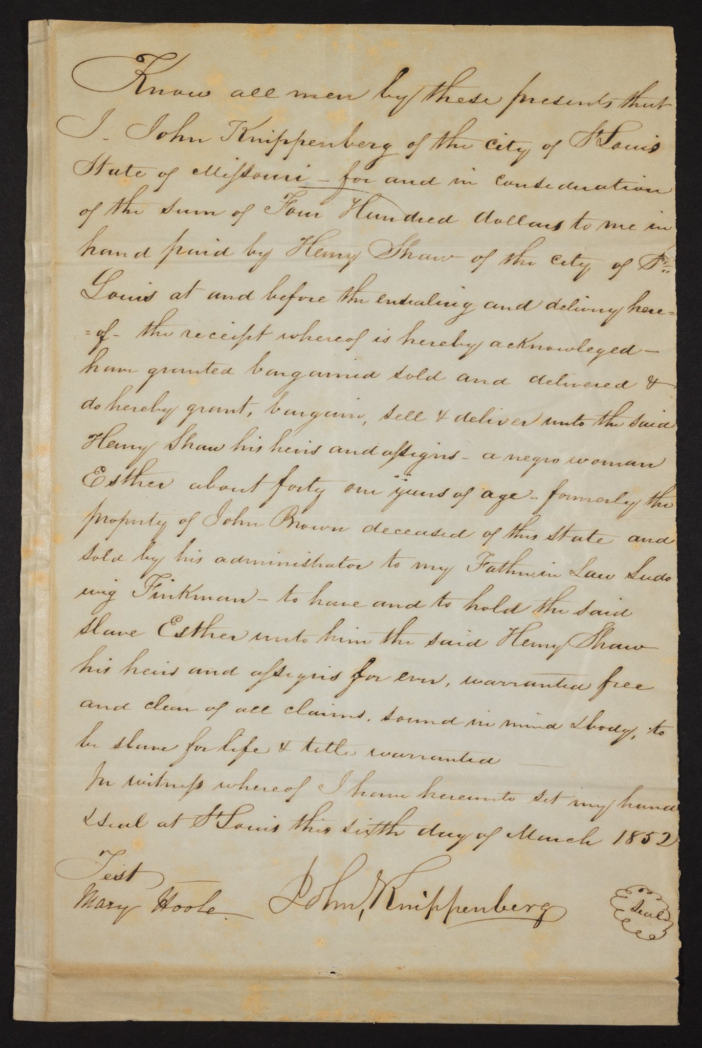 John Knippenberg. 1852. “Bill of Sale for Esther, 1852.”, WashU & Slavery, accessed February 11, 2026, https://digitalexhibits.library.wustl.edu/s/washu-slavery/item/58037