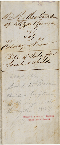 “Bill of Sale for the Purchase of Sarah and Her Infant Child by Henry Shaw, October 1850”. 1850, WashU & Slavery, accessed February 11, 2026, https://digitalexhibits.library.wustl.edu/s/washu-slavery/item/59380