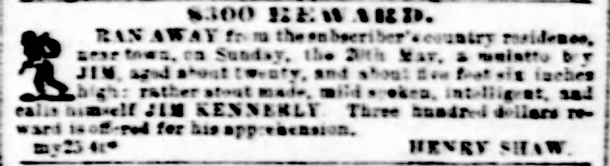 The $300 reward ad placed by Henry Shaw for Jim, a person enslaved by Shaw who escaped.