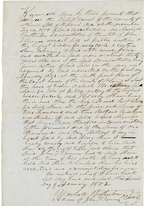 - This is a bill of sale for the purchase of an enslaved person named Jim by Henry Shaw. Henry Shaw purchased from the previous enslaver of Jim, now deceased, John J. Brown. Shaw bid $1010, which, being the highest, allowed him to purchase the enslaved person Jim. Marshall Brotherton(?) acted as the administrator. This ruling was made in the December Term 1851 of the Probate Court of the County of St. Louis, State of Missouri.