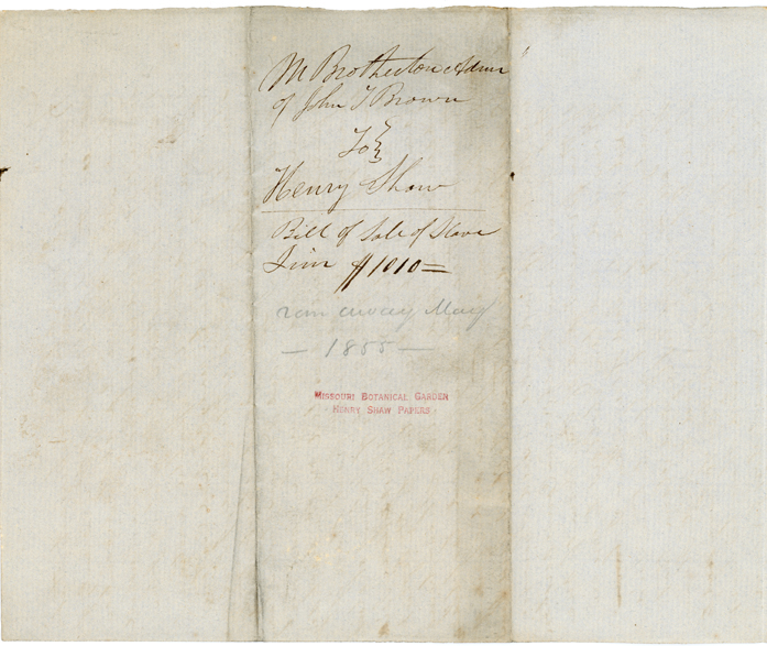 “Bill of Sale for the Purchase of Enslaved Person, Jim, by Henry Shaw in 1852”. 1852, WashU & Slavery, accessed February 12, 2026, https://digitalexhibits.library.wustl.edu/s/washu-slavery/item/59819