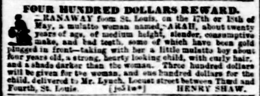- The $400 reward ad placed by Henry Shaw in the Missouri Republican on June 11, 1854, for the return of escaped slave Sarah and her young son.