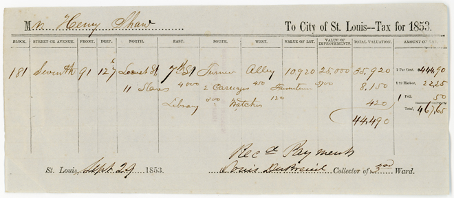 - 1853 tax statement (personal property tax) to the City of Saint Louis from Henry Shaw stating his ownership of 11 enslaved persons.