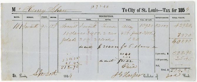 “1854 Tax Statement (personal Property Tax) to the City of Saint Louis from Henry Shaw Stating His Ownership of Ten Enslaved Persons”. 1854. 1853 Tax Statement (personal Property Tax) to the City of Saint Louis from Henry Shaw Stating His Ownership of 11 Enslaved Persons., WashU & Slavery, accessed February 11, 2026, https://digitalexhibits.library.wustl.edu/s/washu-slavery/item/59910