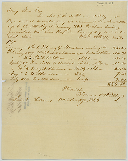Medical bill for care of Henry Shaw and people he enslaved at Tower Grove by Dr. Thomas O'Reilly, 2 October 1860