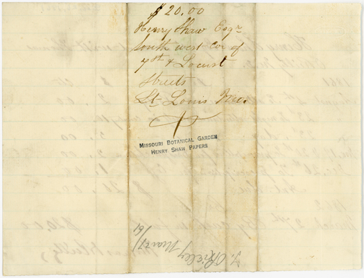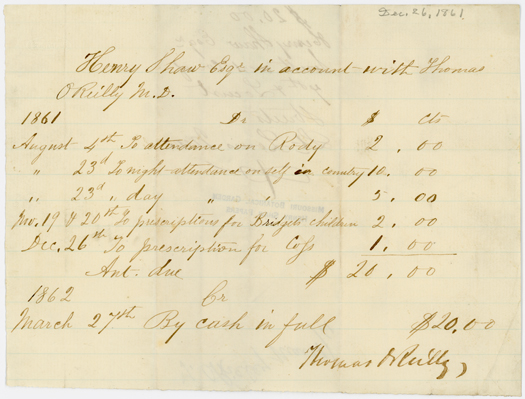 Medical bill for care of Henry Shaw and his enslaved persons at his St. Louis townhouse in 1861 by Dr. Thomas O'Reilly.