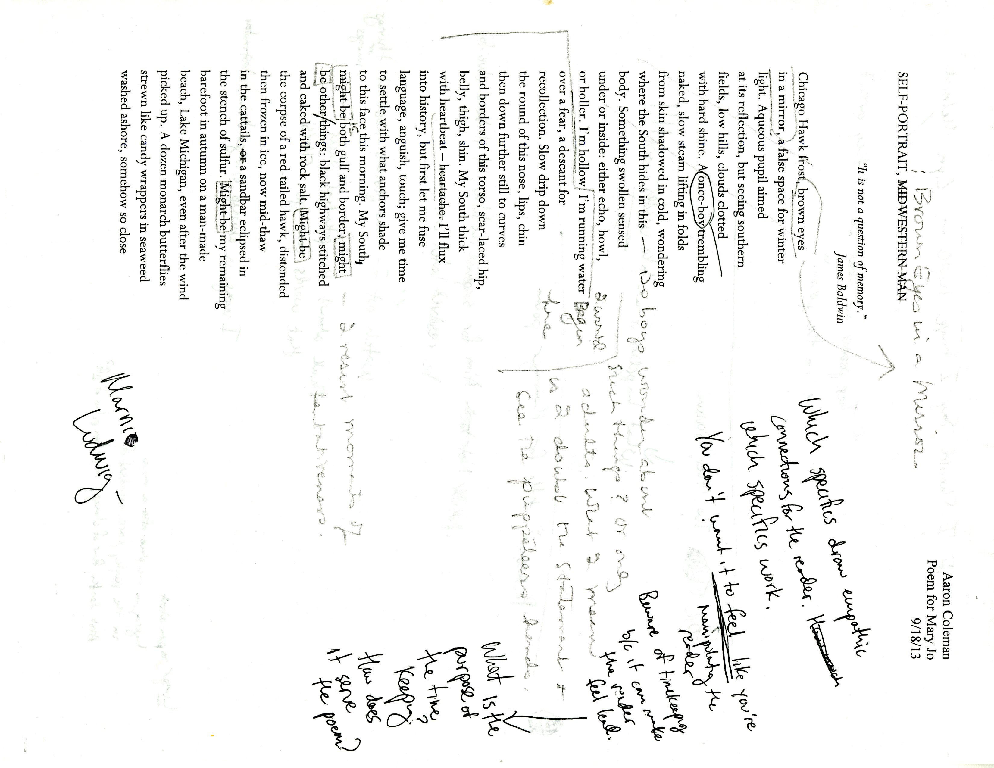 - Workshop notes from a MFA poetry classmate and Professor Mary Jo Bang on a poem. Coleman kept many such worksheets to help document the revision process.