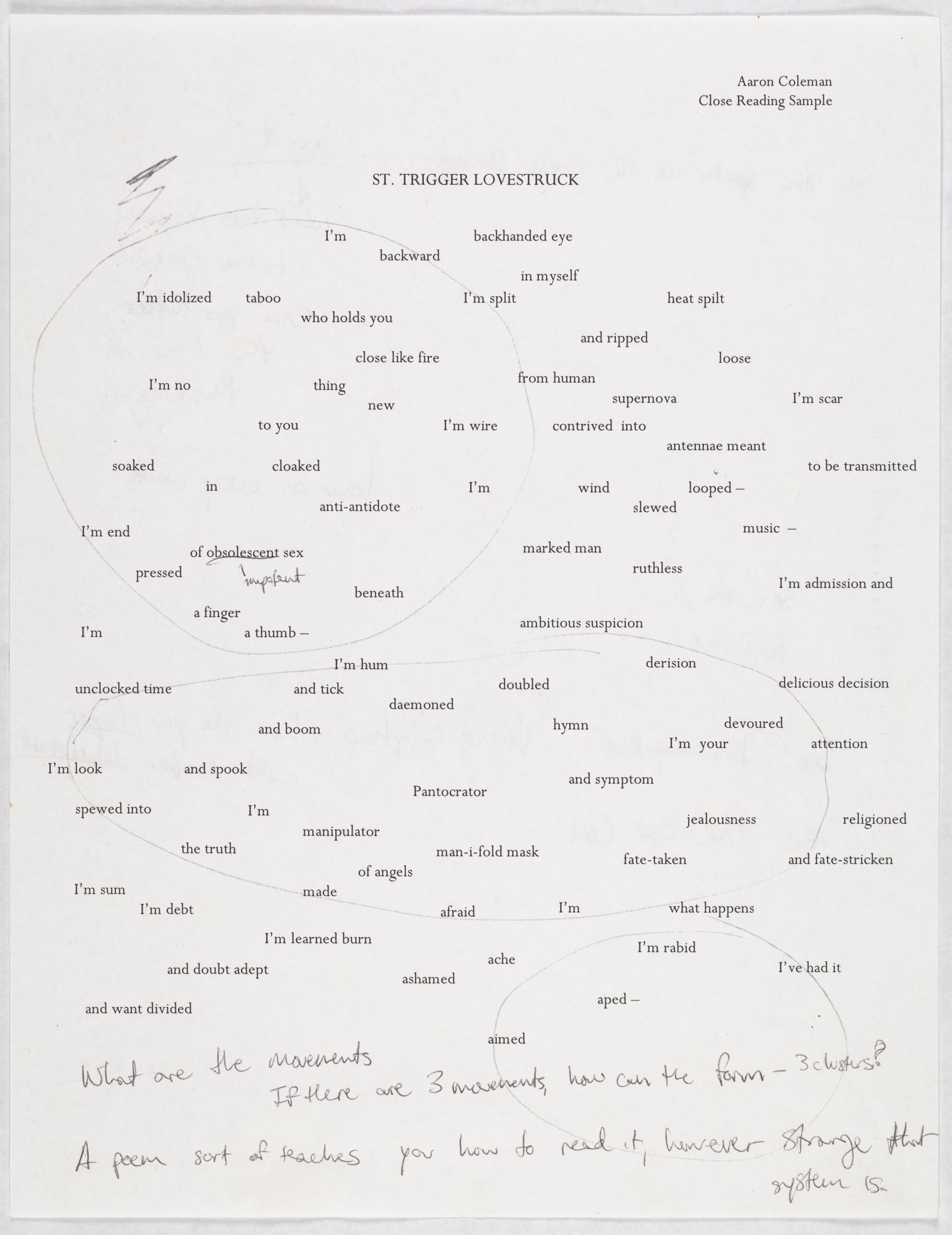 Coleman, Aaron. 2013. “‘St. Trigger’ Draft”. Paper. Threat Come Close, Tribeca, New York, NY: Four Way Books, Wherein I am: Highlights from the Aaron Coleman Papers, accessed February 11, 2026, https://digitalexhibits.library.wustl.edu/s/whereiniam/item/45232
