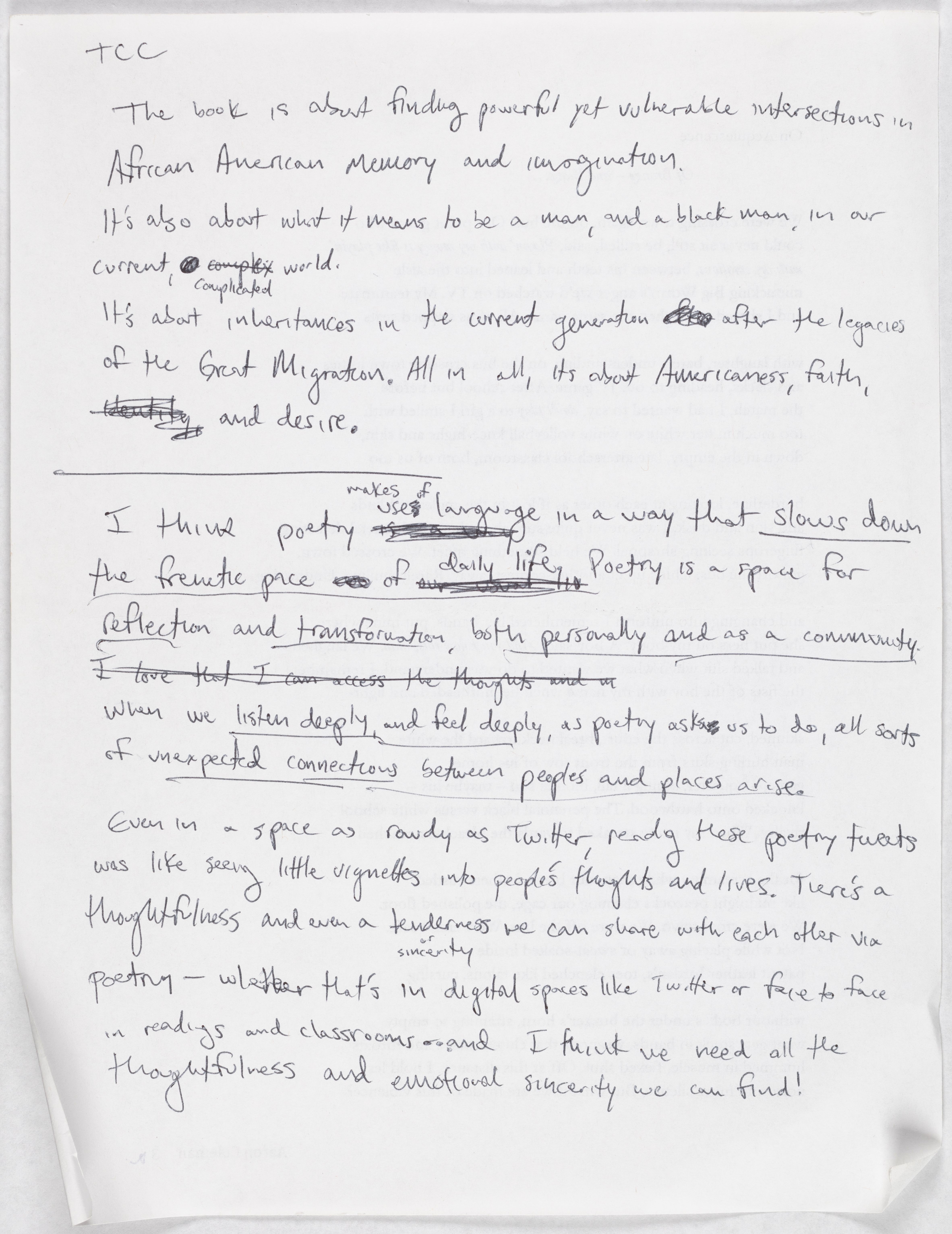 - Coleman's handwritten notes from an NPR Interview on Poetry and Translation for National Poetry Month prepare for a discussion on his book of poems, Threat Come Close. He writes, "The book is about finding powerful yet vulnerable intersections in African American memory and imagination. It's also about what it means to be a man, and a black man in our current, complicated world..."