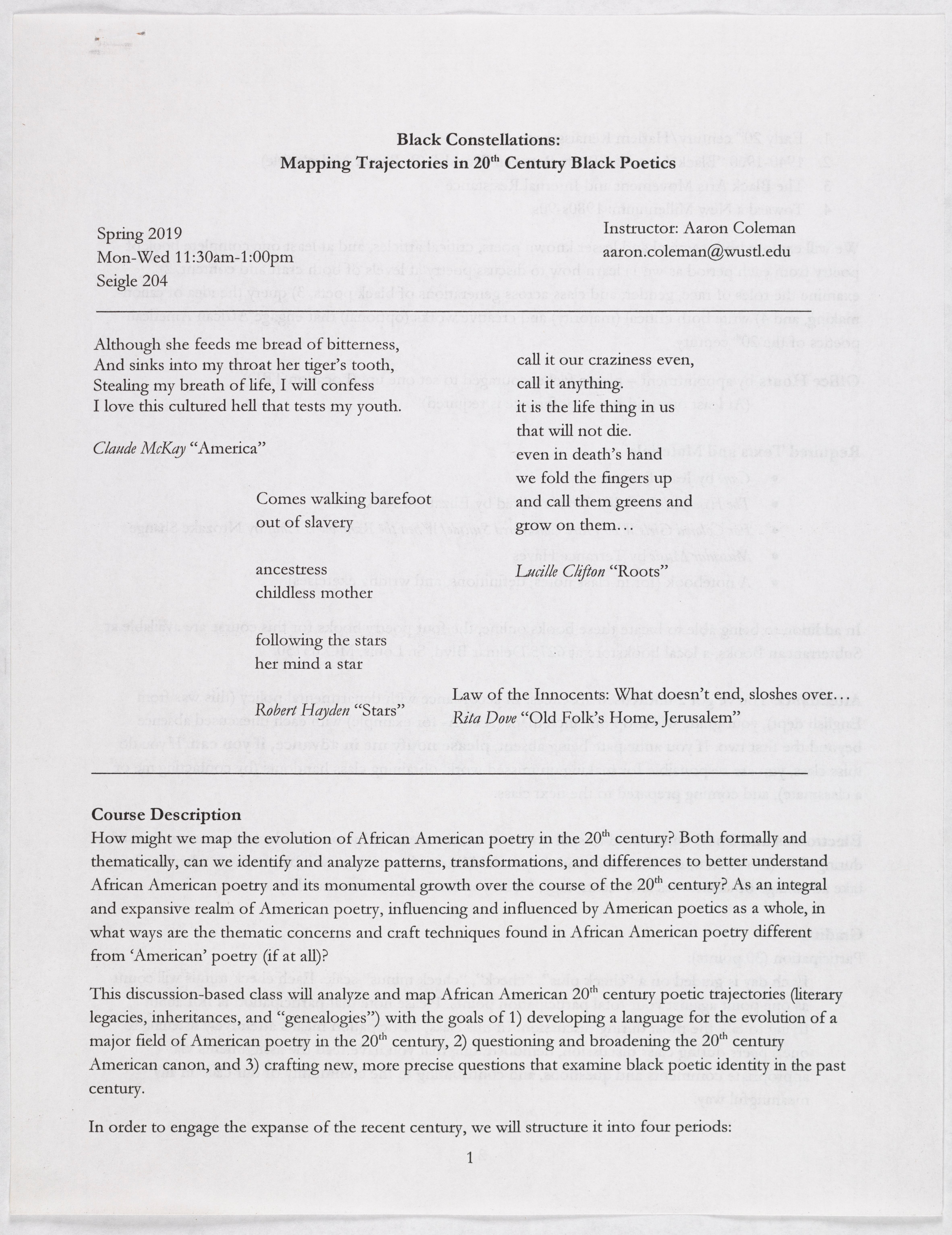- Coleman created this syllabus for a Black Constellations course, which he created during his third year in the Comparative Literature PhD program. The course mapped trajectories in 20th Century Black poetics.