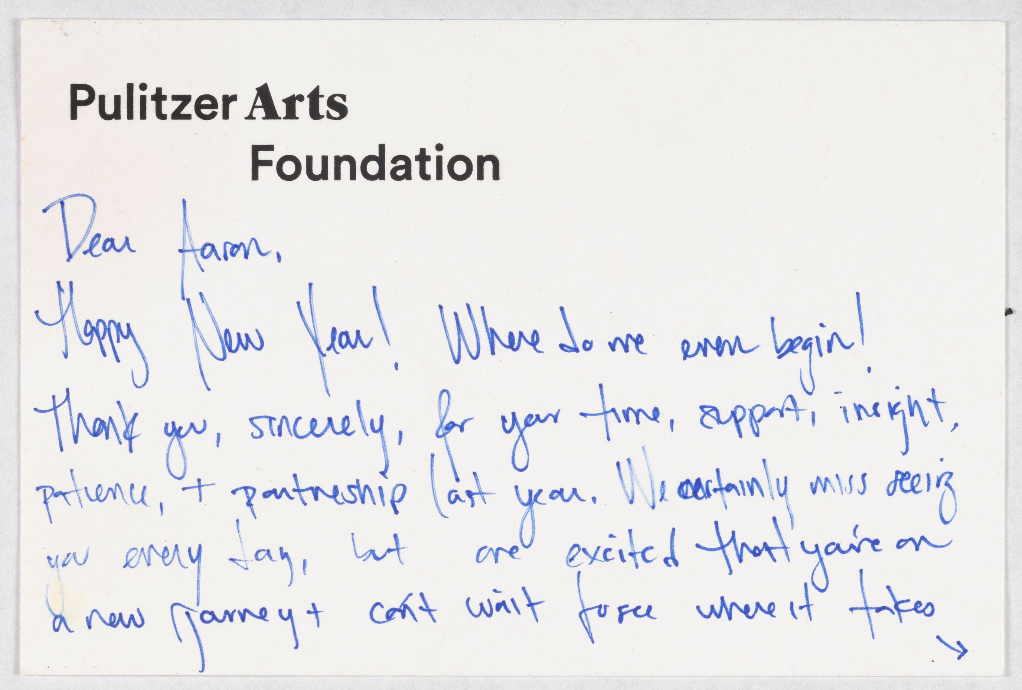 - This thank you note was given to Coleman at the same time he was gifted a framed photograph from the Pulitzer Arts Foundation on his last day of work as Public Arts Project Assistant. This moment marked the end of his third year fellowship in the MFA program, and the precipice of beginning the International Writer track in the Comparative Literature department at Washington University in St. Louis.