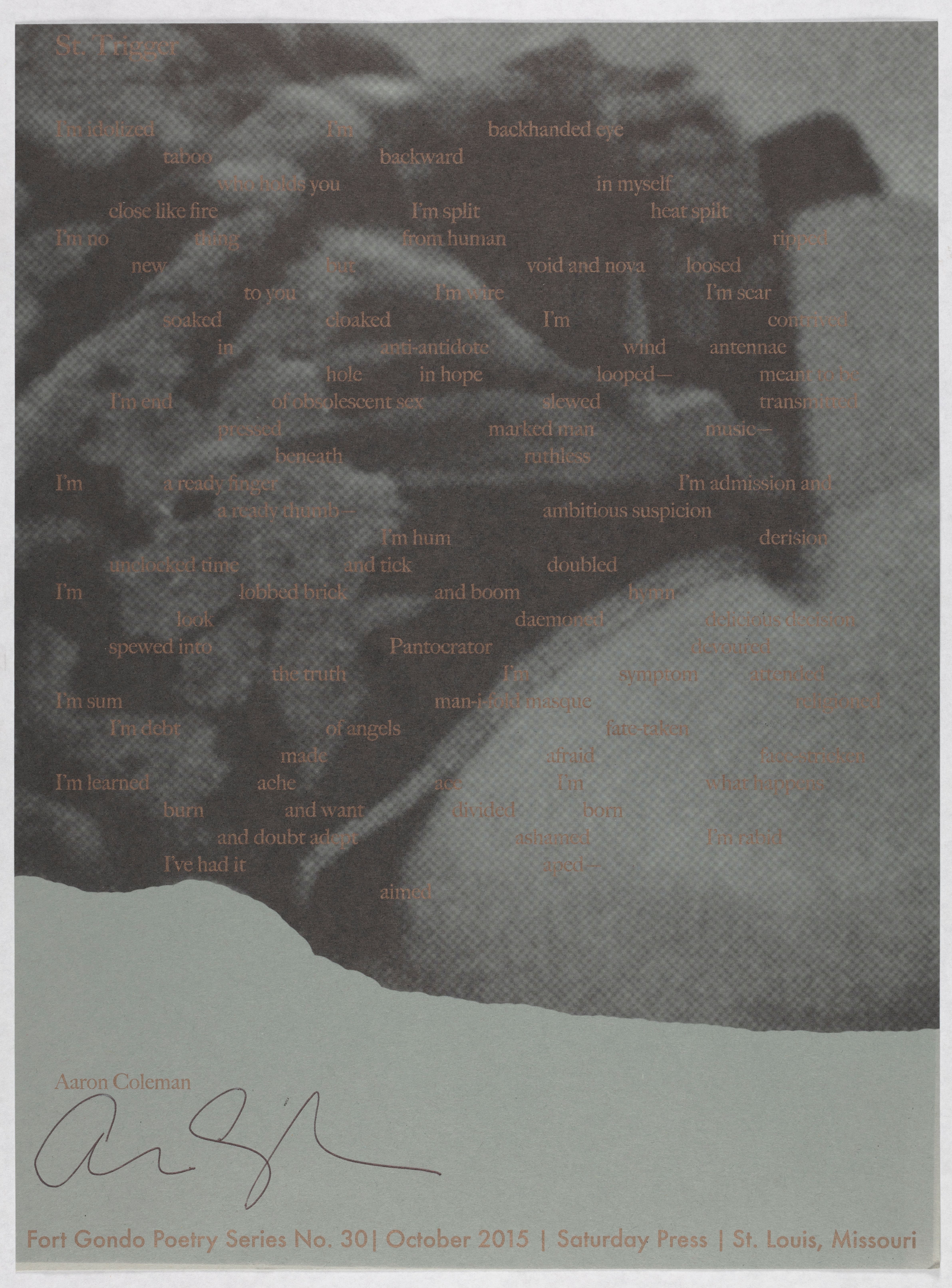 Coleman, Aaron. 2015. “Fort Gondo ‘St. Trigger’ Broadside”. Paper. 2015 Fort Gondo Poetry Series Curated by Jessica Baran and Ted Mathys. Saturday Press, Wherein I am: Highlights from the Aaron Coleman Papers, accessed February 11, 2026, https://digitalexhibits.library.wustl.edu/s/whereiniam/item/45309
