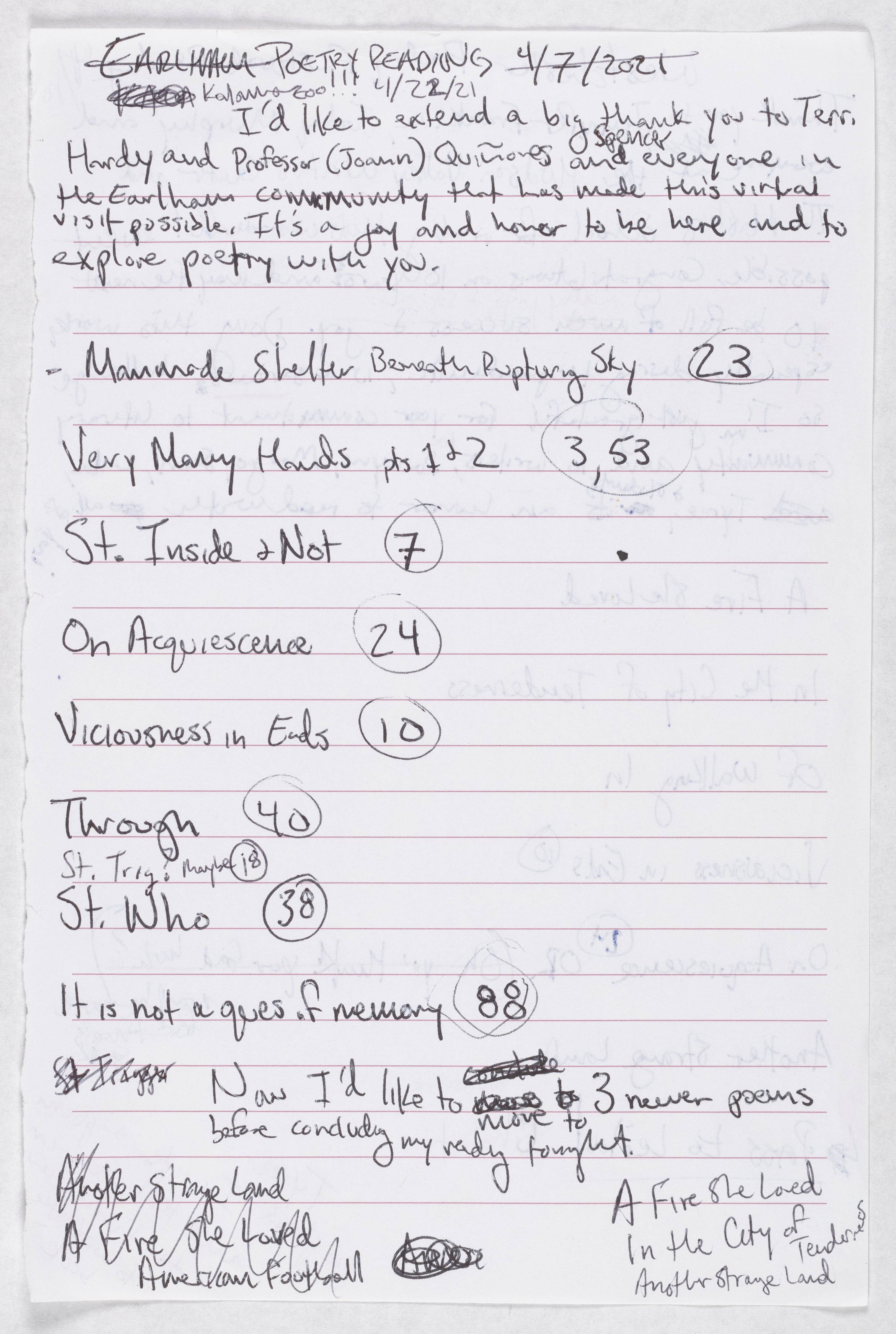 - Coleman created this poetry set list in anticipation of in anticipation of his virtual readings at Earlham College and Kalamazoo College. Handwritten notes include his gratitude to the organizers, as well as a list of ordered poems.