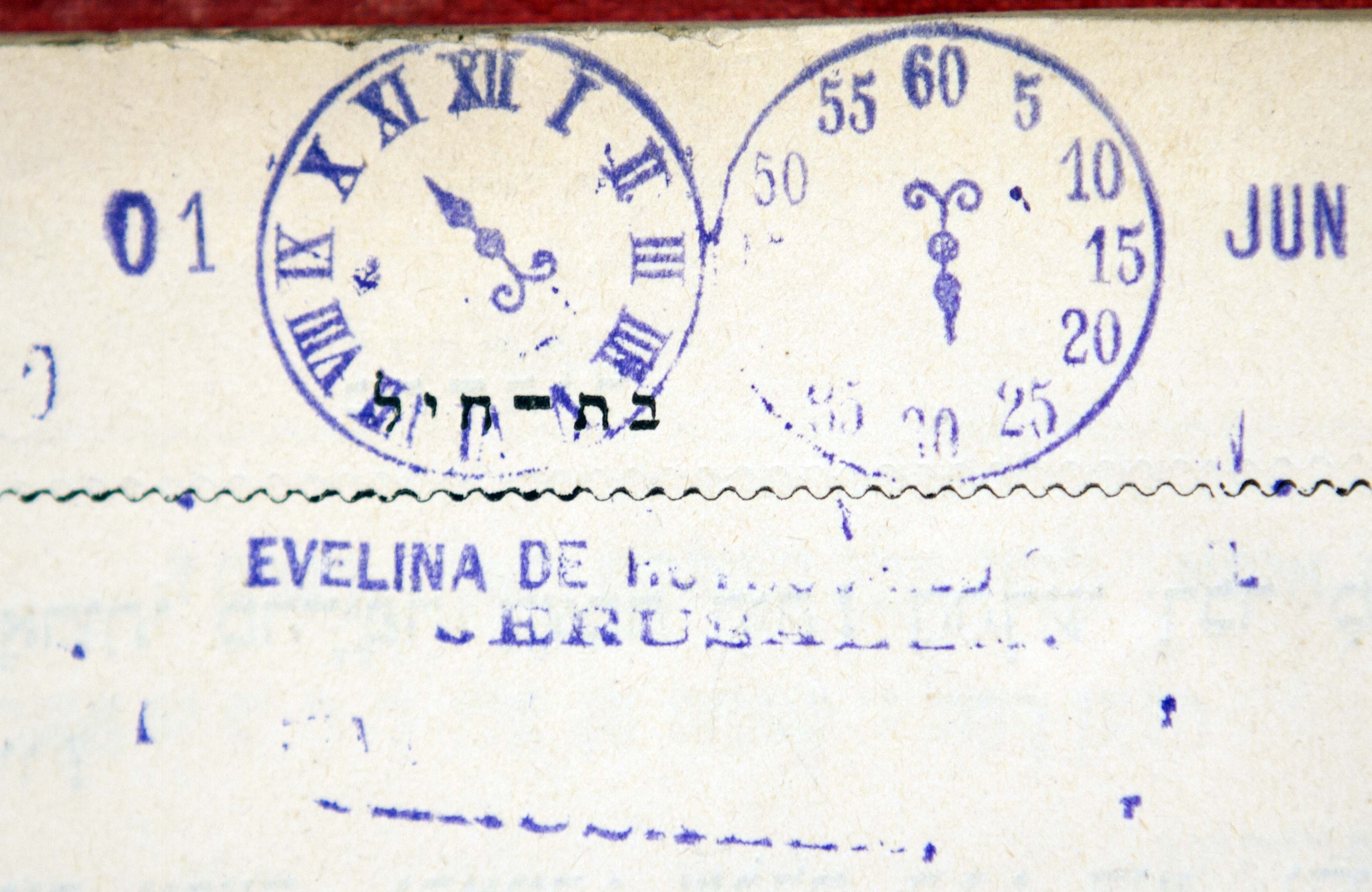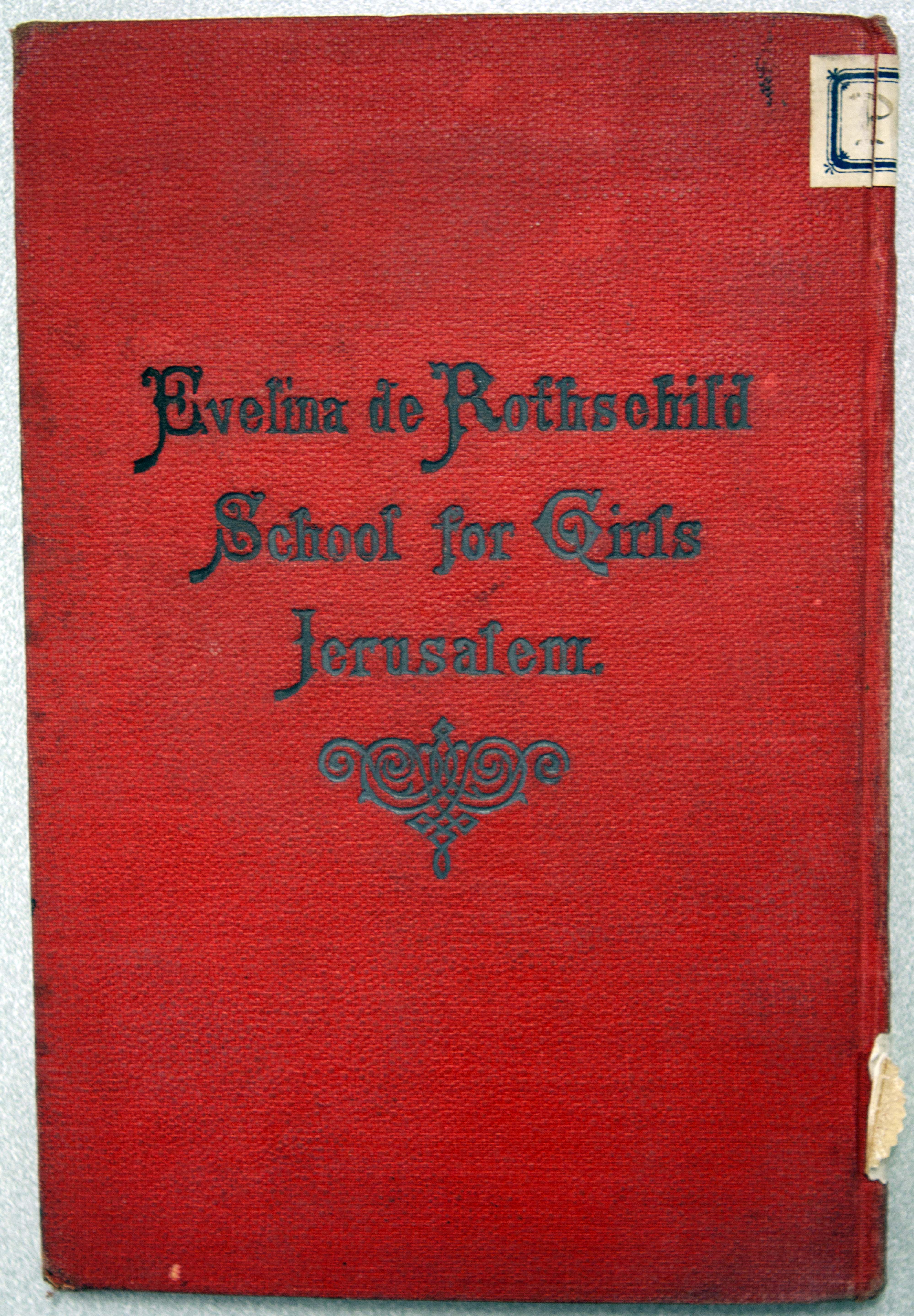 This is the stamped book cover of the Evelina de Rothschild Girls' School (est. 1854), the first all-girls school in Palestine. It was originally founded by Dr. Albert Cohen in the Old City of Jerusalem and taught the students domestic trades, such as sewing and knitting.