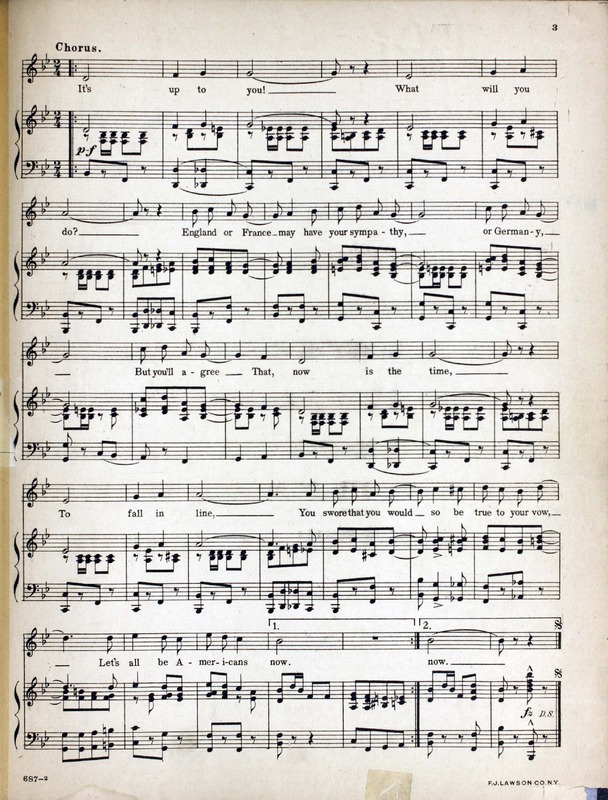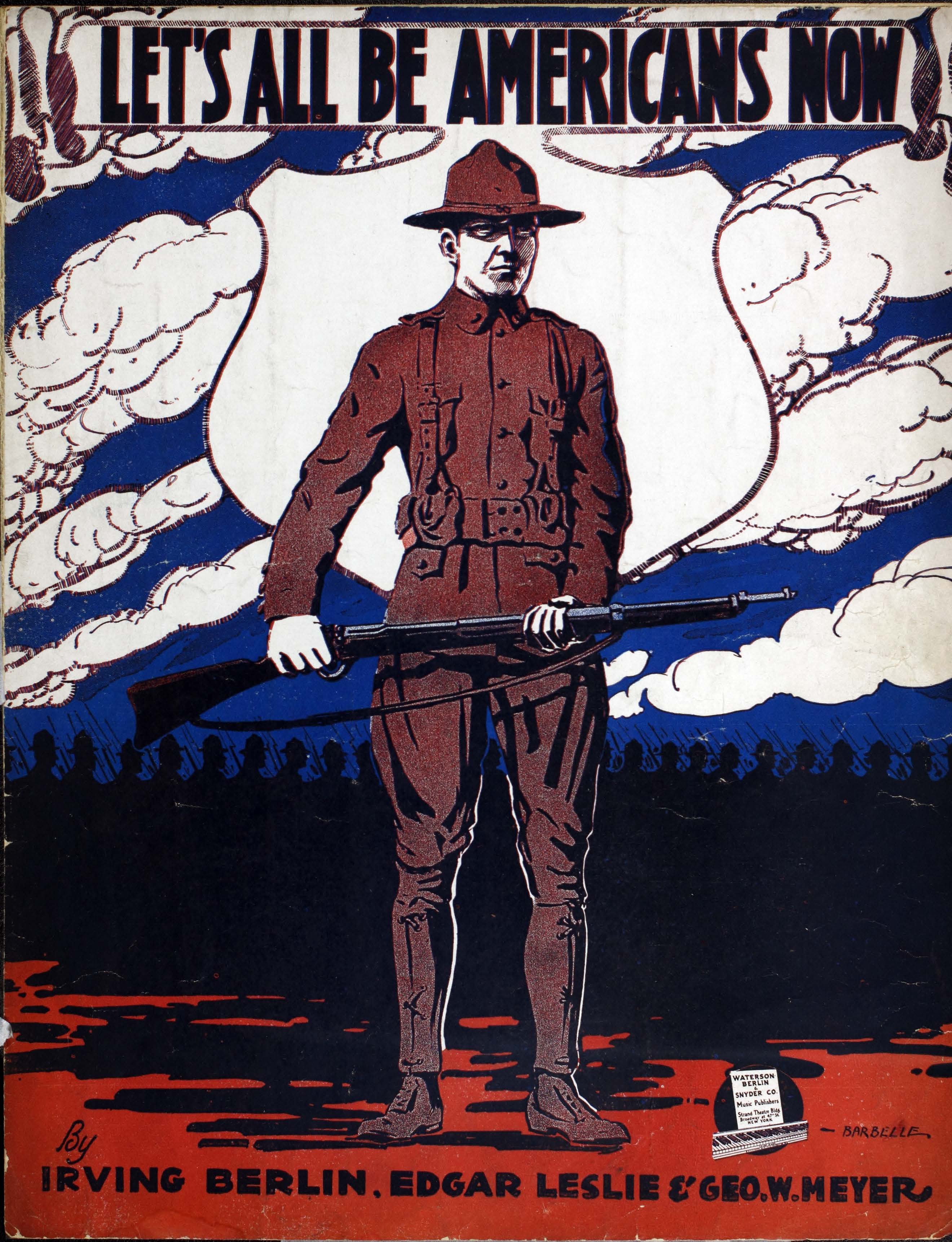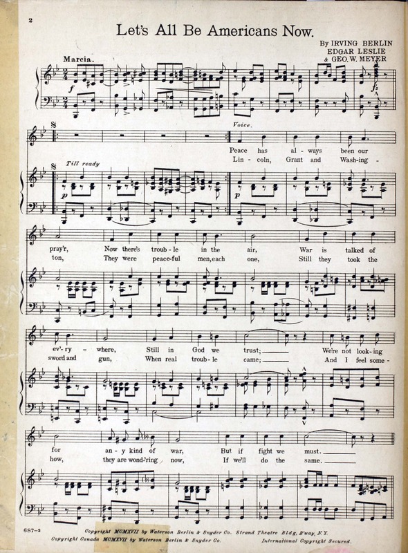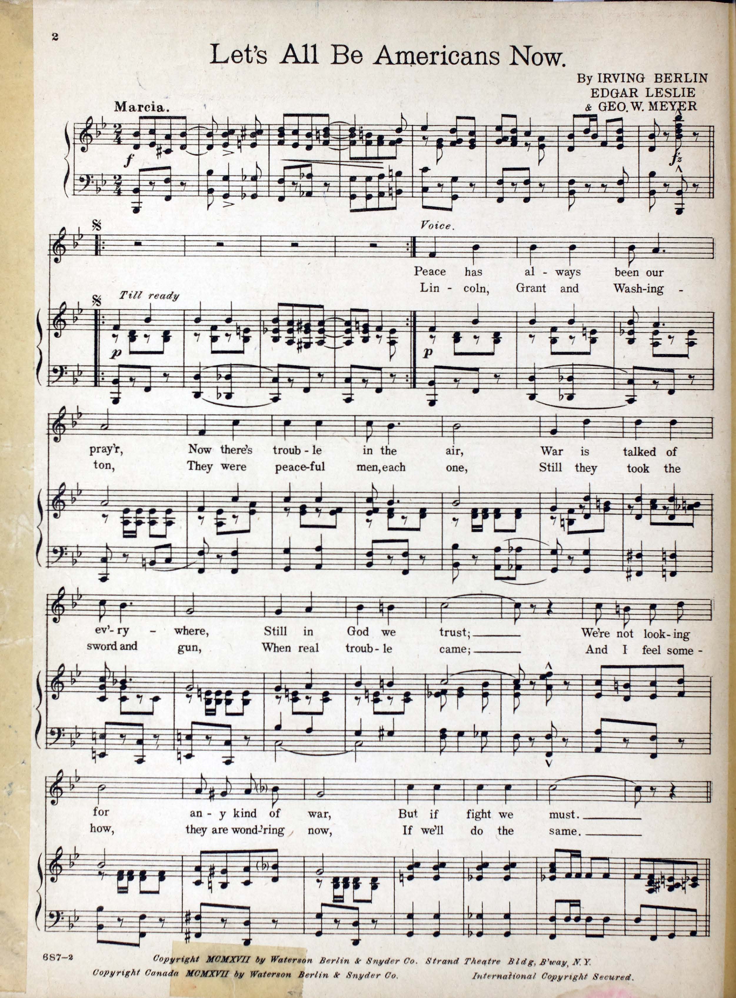 Berlin, Irving, 1888-1989. 2000. “Let’s All Be Americans Now By Irving Berlin, Edgar Leslie, & Geo. W. Meyer”. New York (Strand Theatre Bldg., Broadway at 47th St.) : Waterson, Berlin and Snyder Co., music publishers, World War I Sheet Music, accessed February 12, 2026, https://digitalexhibits.library.wustl.edu/s/wwimusic/item/35624