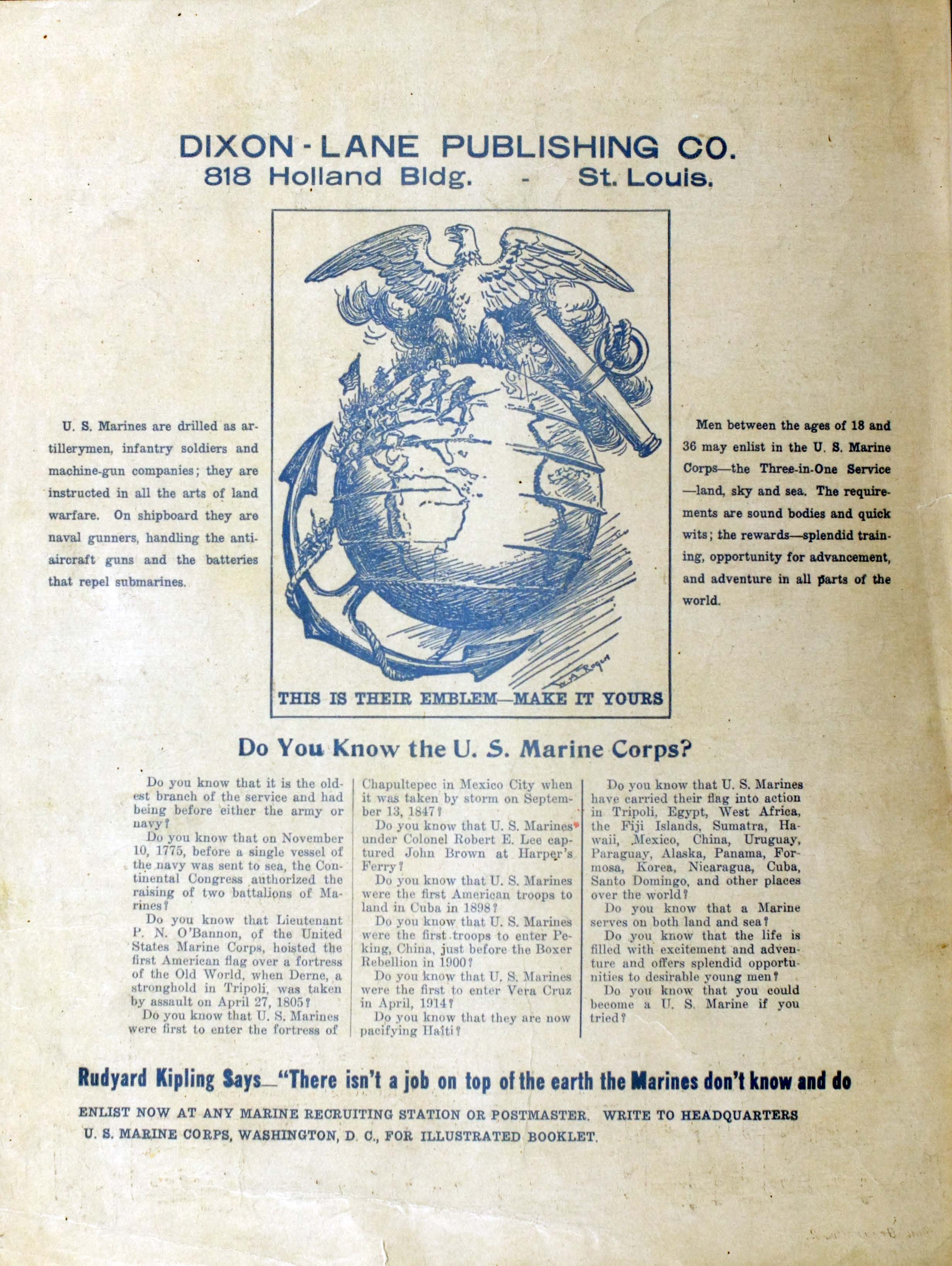 - T.p. ill.: Marine standing at attention on shore, with battleship and biplane in background; Marine Corps logo and motto superimposed.
