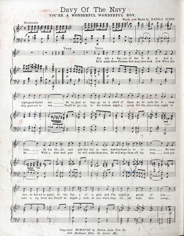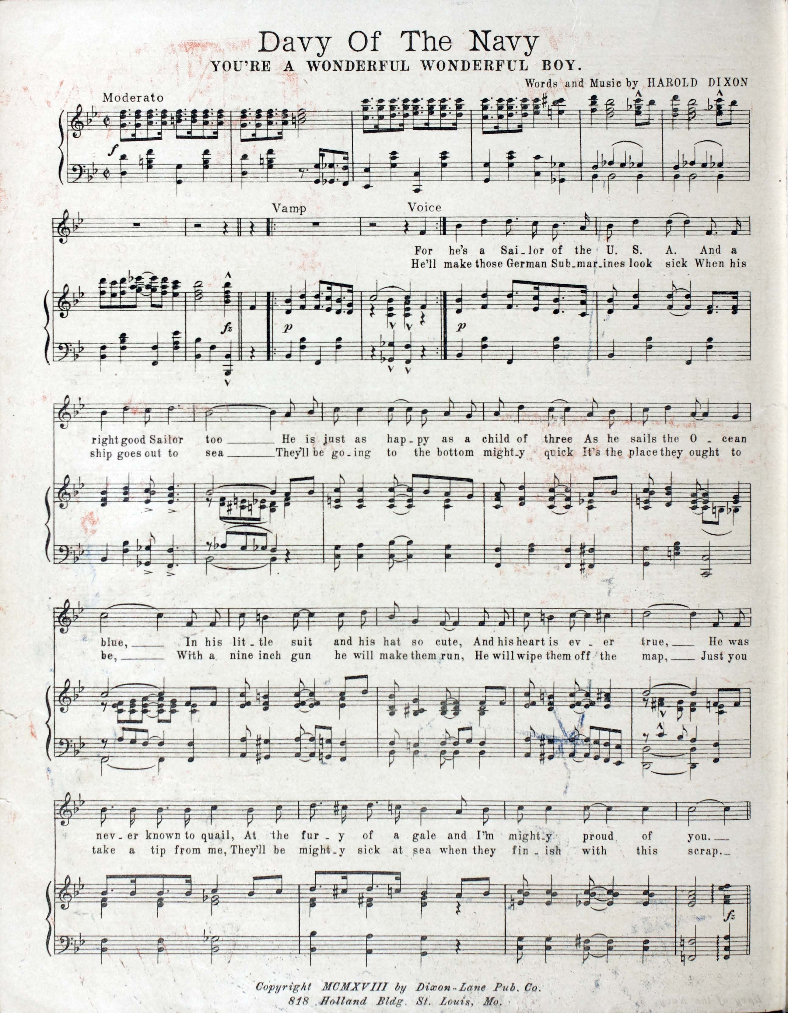 Dixon, Harold. 2000. “Davy of the Navy : Your [sic] a Wonderful Boy Words & Music, Harold Dixon”. Chicago ; St. Louis : Dixon-Lane Pub. Co, World War I Sheet Music, accessed February 11, 2026, https://digitalexhibits.library.wustl.edu/s/wwimusic/item/35632