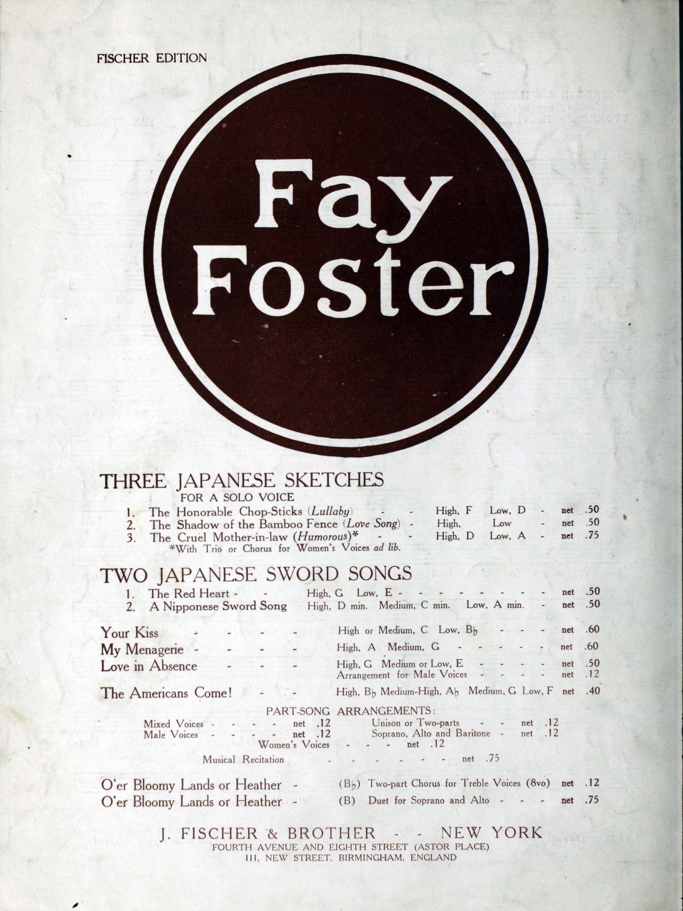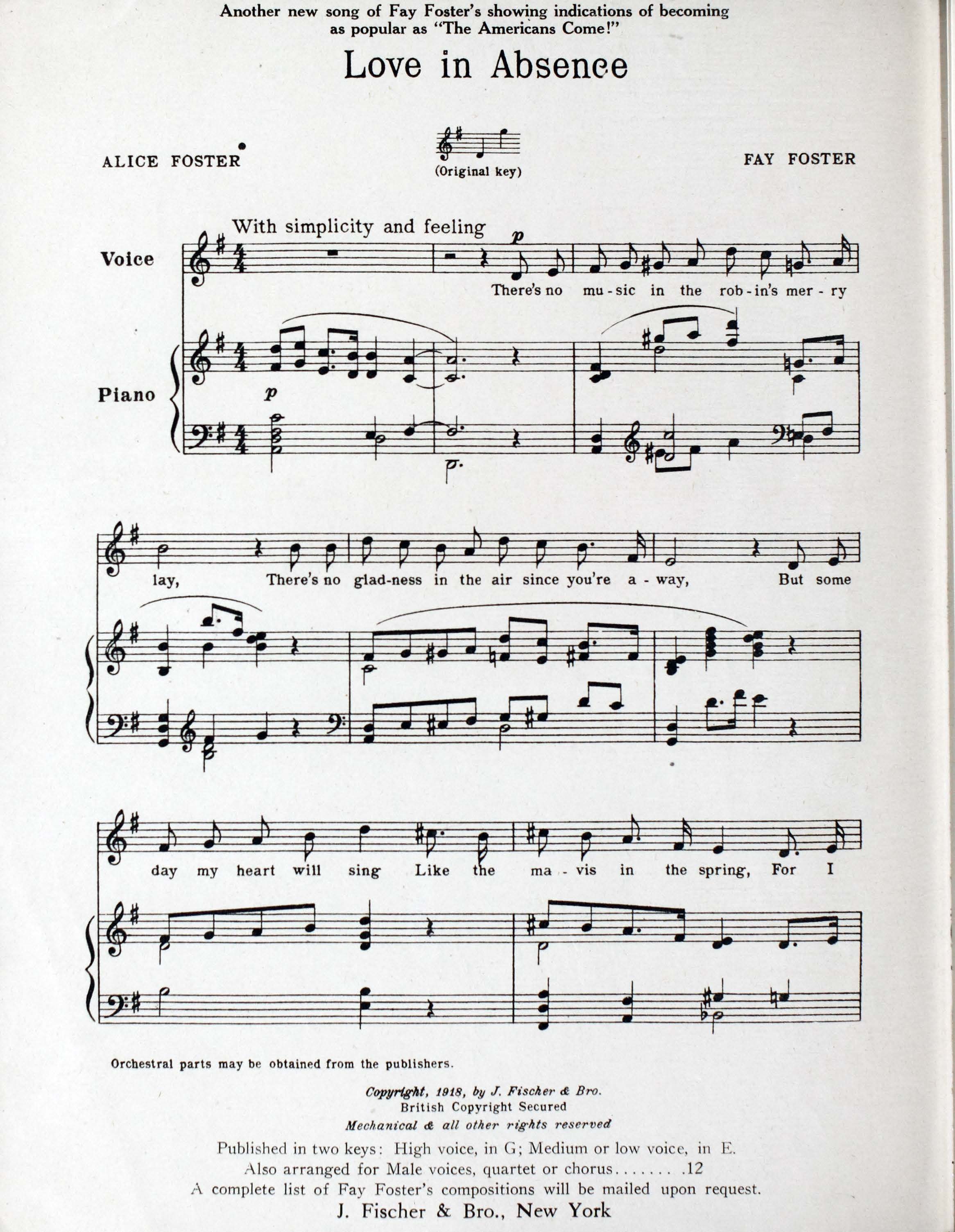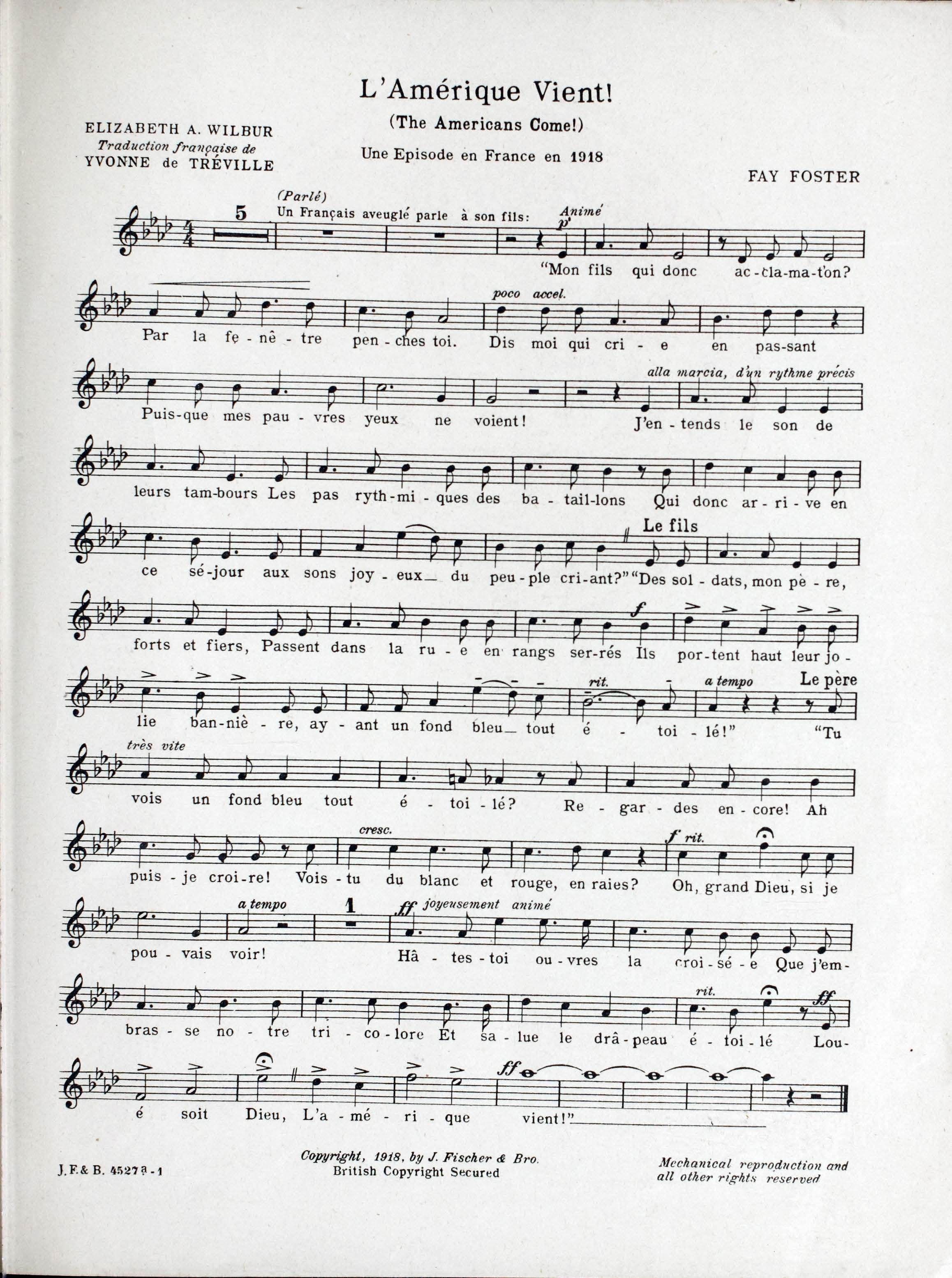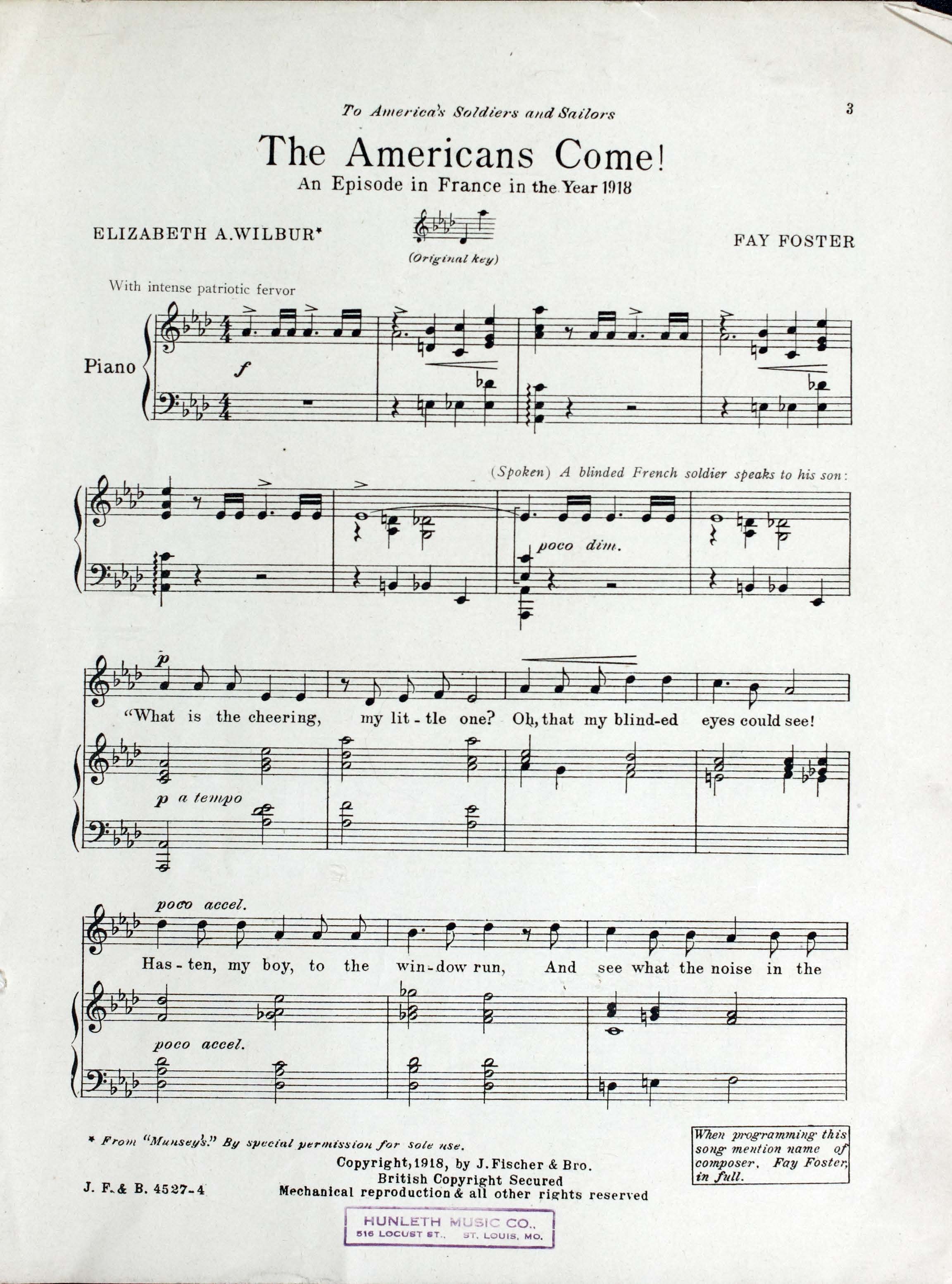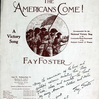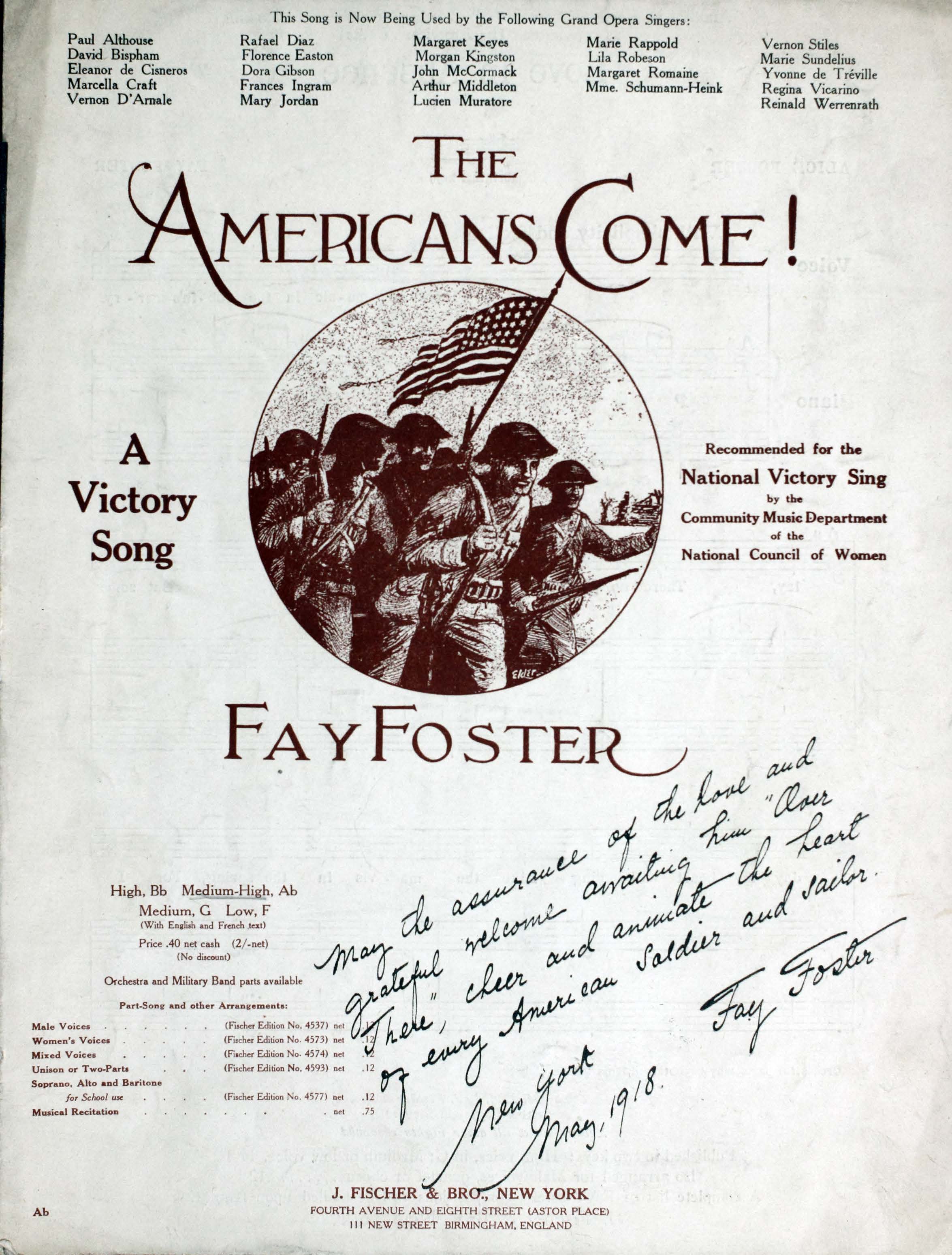 Foster, Fay, 1886-1960. 2000. “The Americans Come! : A Victory Song Fay Foster”. New York (Fourth Avenue and Eighth Street (Astor Place)) : J. Fischer & Bro, World War I Sheet Music, accessed February 13, 2026, https://digitalexhibits.library.wustl.edu/s/wwimusic/item/35644