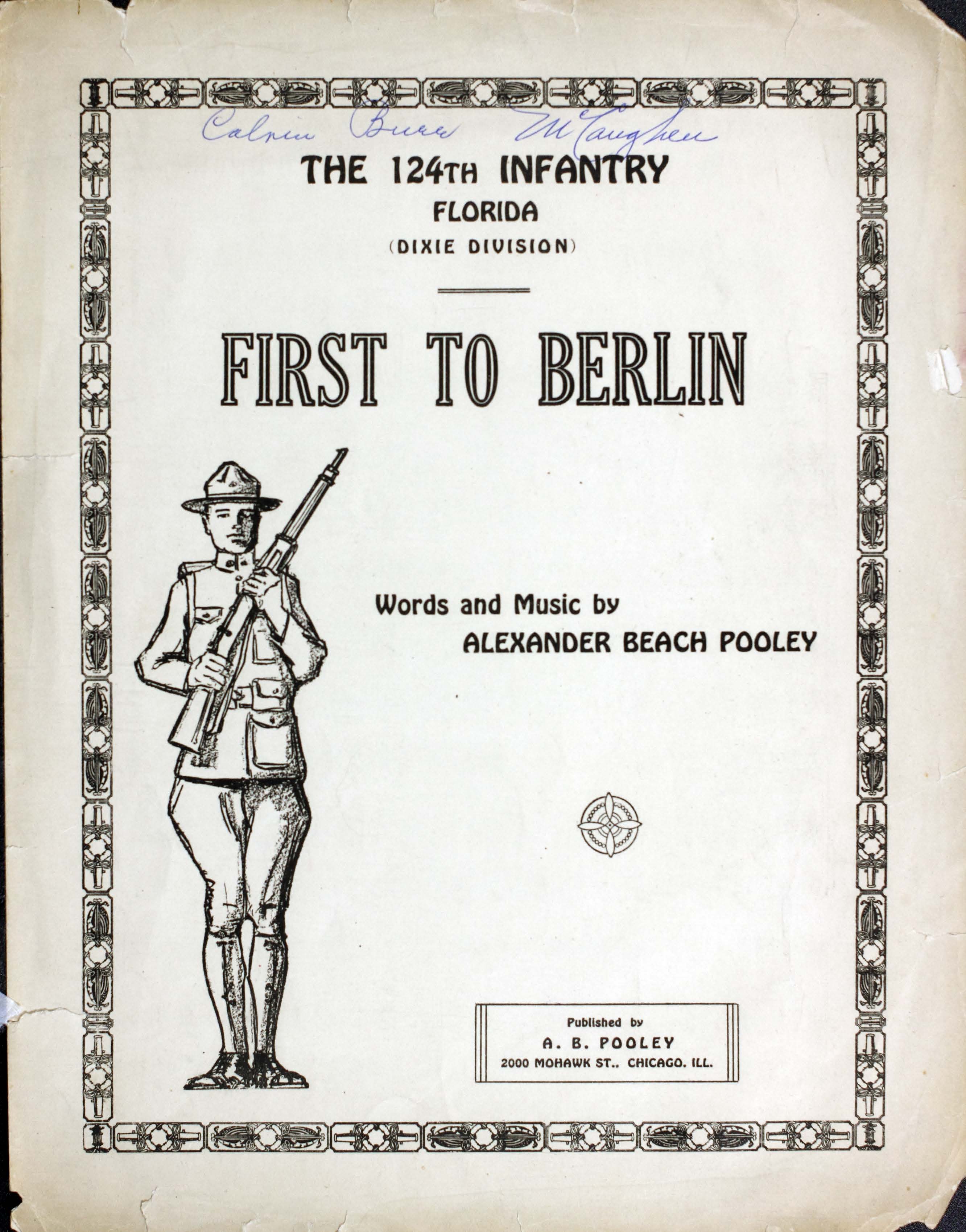 Pooley, Alexander Beach. 2000. “First to Berlin Words and Music by Alexander Beach Pooley”. Chicago, Ill. (2000 Mohawk St.) : published by A.B. Pooley, World War I Sheet Music, accessed April 26, 2026, https://digitalexhibits.library.wustl.edu/s/wwimusic/item/35653
