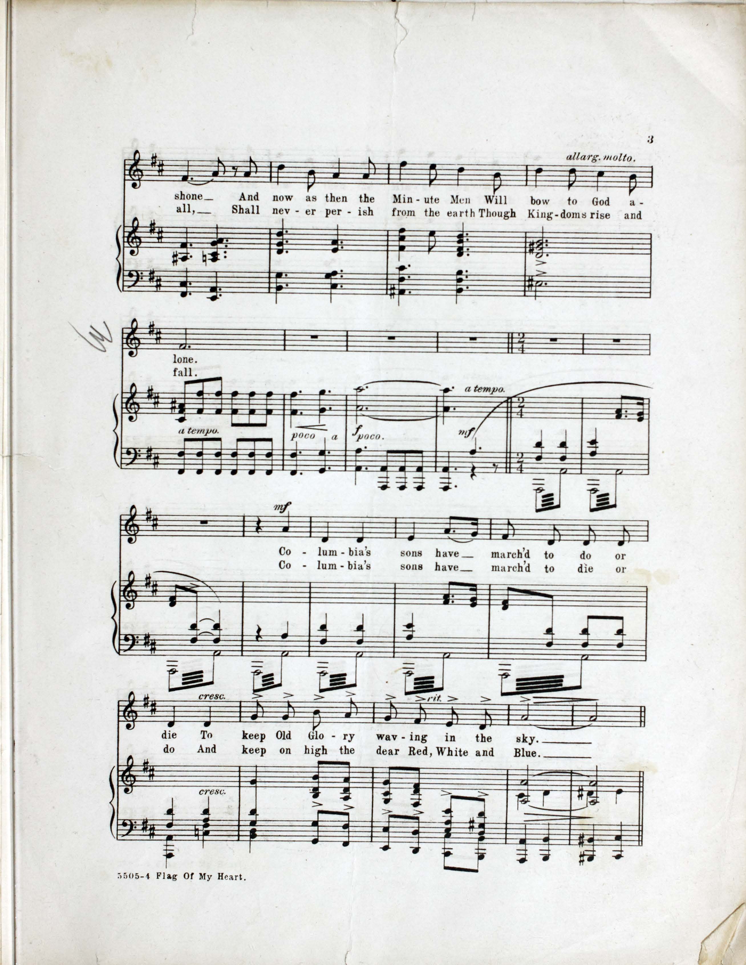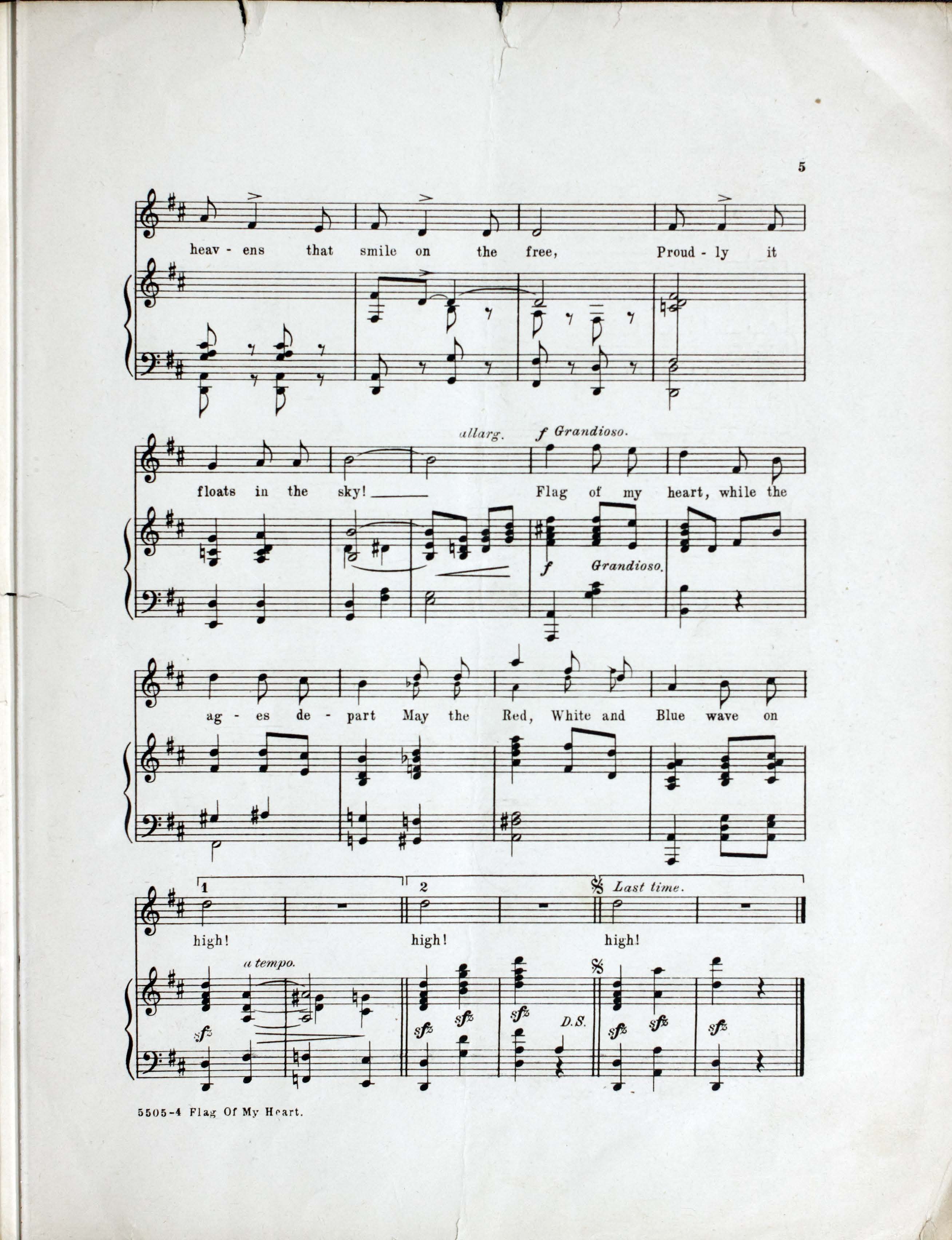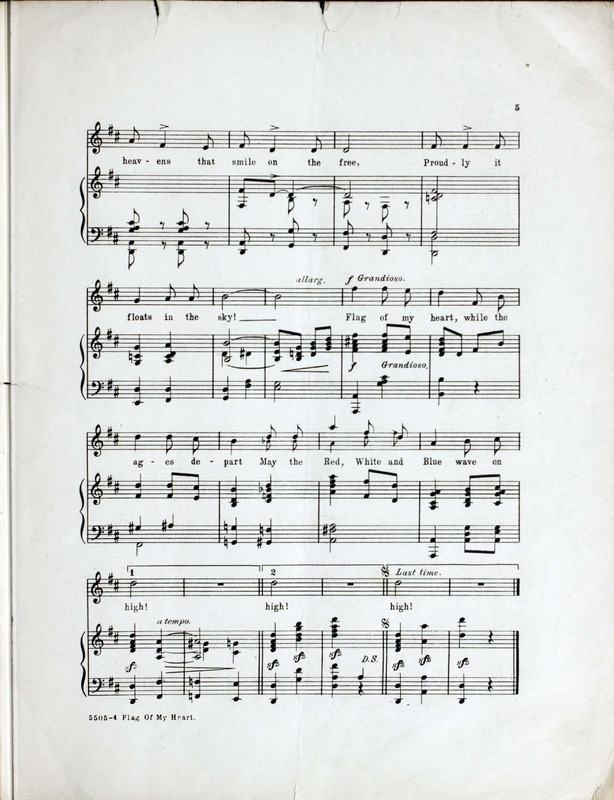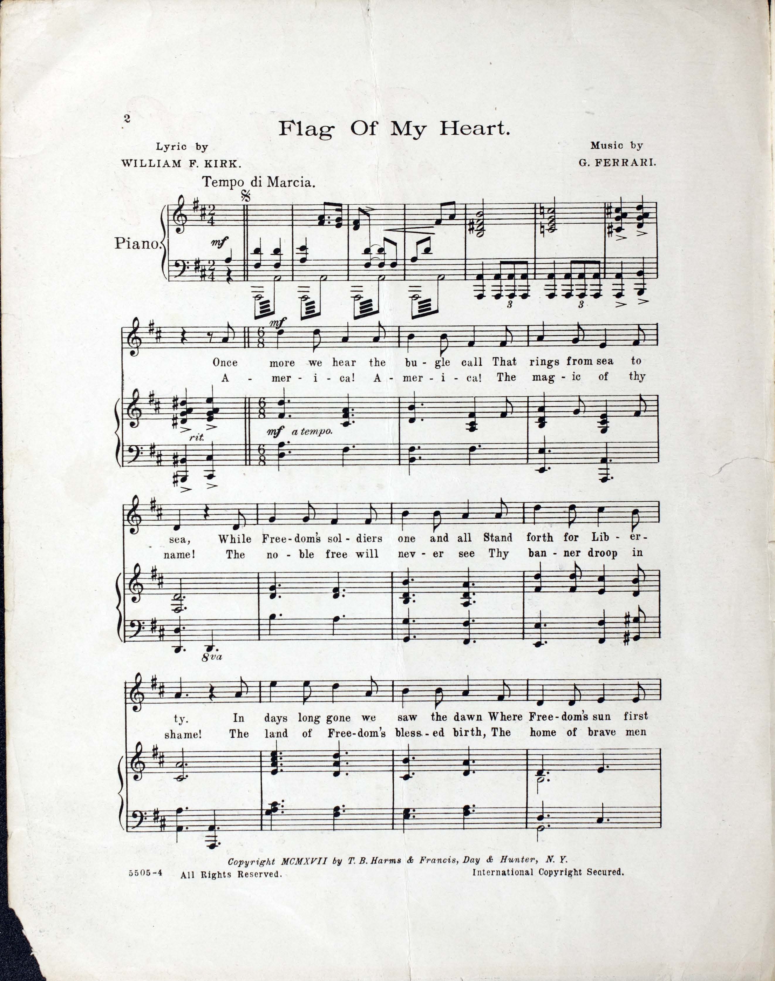 Ferrari, Gustave, 1872-1948. 2000. “Flag of My Heart Lyric by William F. Kirk ; Music by G. Ferrari”. New York : T.B. Harms : Francis, Day & Hunter, World War I Sheet Music, accessed February 12, 2026, https://digitalexhibits.library.wustl.edu/s/wwimusic/item/35654